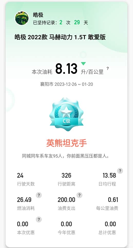 纯油车平时主要是上下班使用单里程一般超过10公里,春秋天油耗基本在7个左右,单次最低能到6个,最近天冷了油耗直线上升最高达到了8个多。
