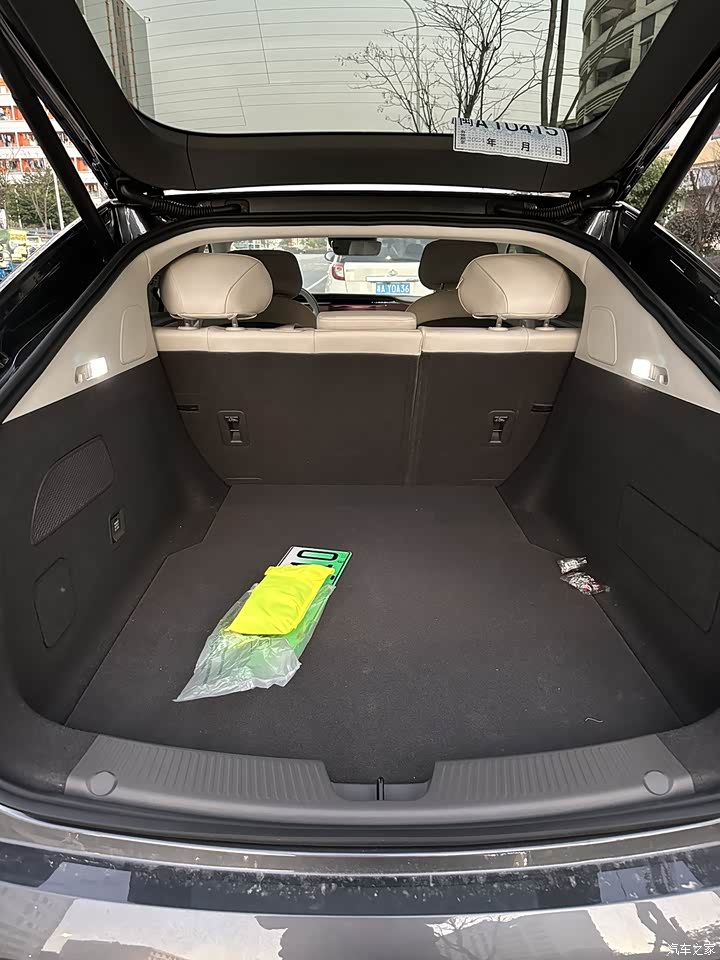 在前排调整完坐姿后,后排也能有较大的活动空间。虽然电车由于电池的原因,高地台不可避免,但是坐在后排双脚也可以伸展开,减少了坐小板凳的尴尬。后备箱比想象中的要大不少,在后排没乘客的情况下还可以把后排放倒,增加储物空间。