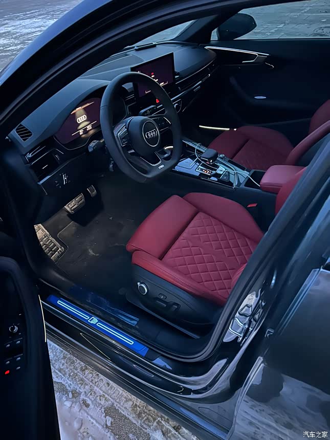 红色内饰,该皮的地方皮,该毛的地方毛,该碳的地方碳都还可以,就是中控啊,那个悬浮屏怎么看怎么别扭。过了8年又搞回A4系列感觉变化不大。