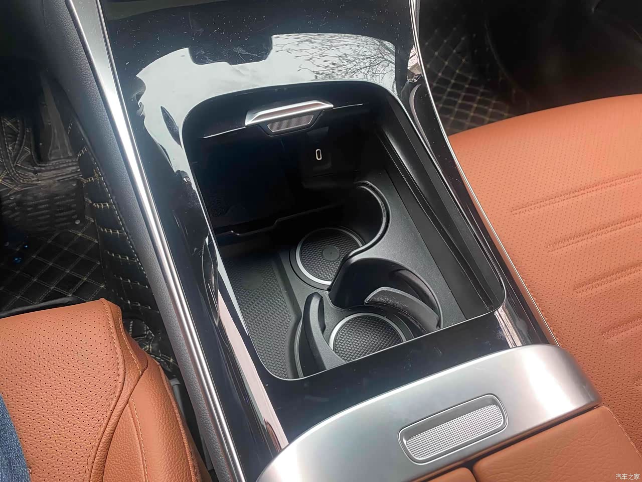 中控储物这块设计的比较紧凑,杯架大小一般,比较大的茶杯是放不下的,放手机的位置和杯架一样深,拿手机的时候不太顺手。