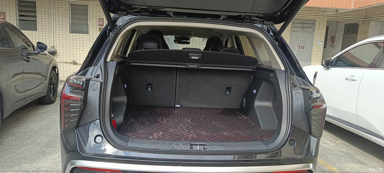 作为SUV来说,后备箱整体高度还是设计比较合理,拿取东西方便,整体体积也比较大的,如果放比较高的物体可以把隐私挡板取下,整体进深还是很长的,如果是两人出去长途自驾,完全可以放到后排睡个1.8的人完全没有问题。侧面也有外接电源输出,相当的棒。