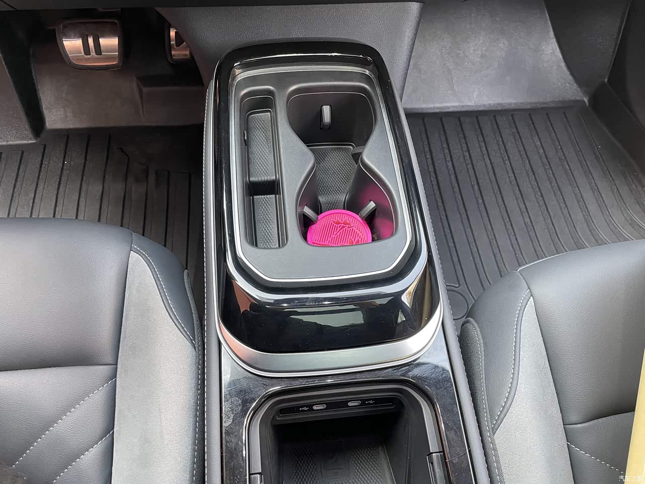 感觉杯架设计的有点小,媳妇买了一个圆鼓鼓的杯子尽然放不下。扶手箱的空间还行,能装很多杂物。