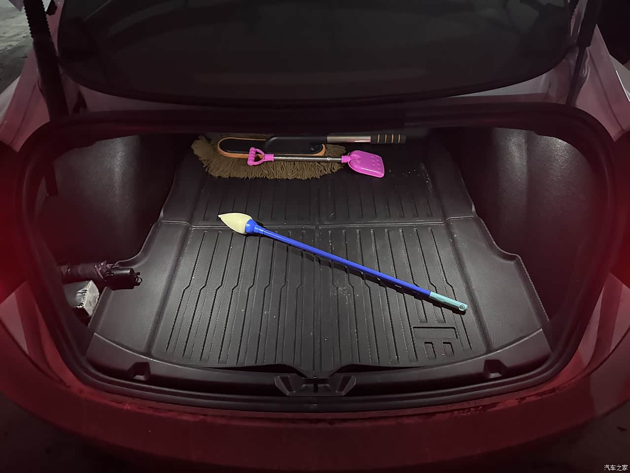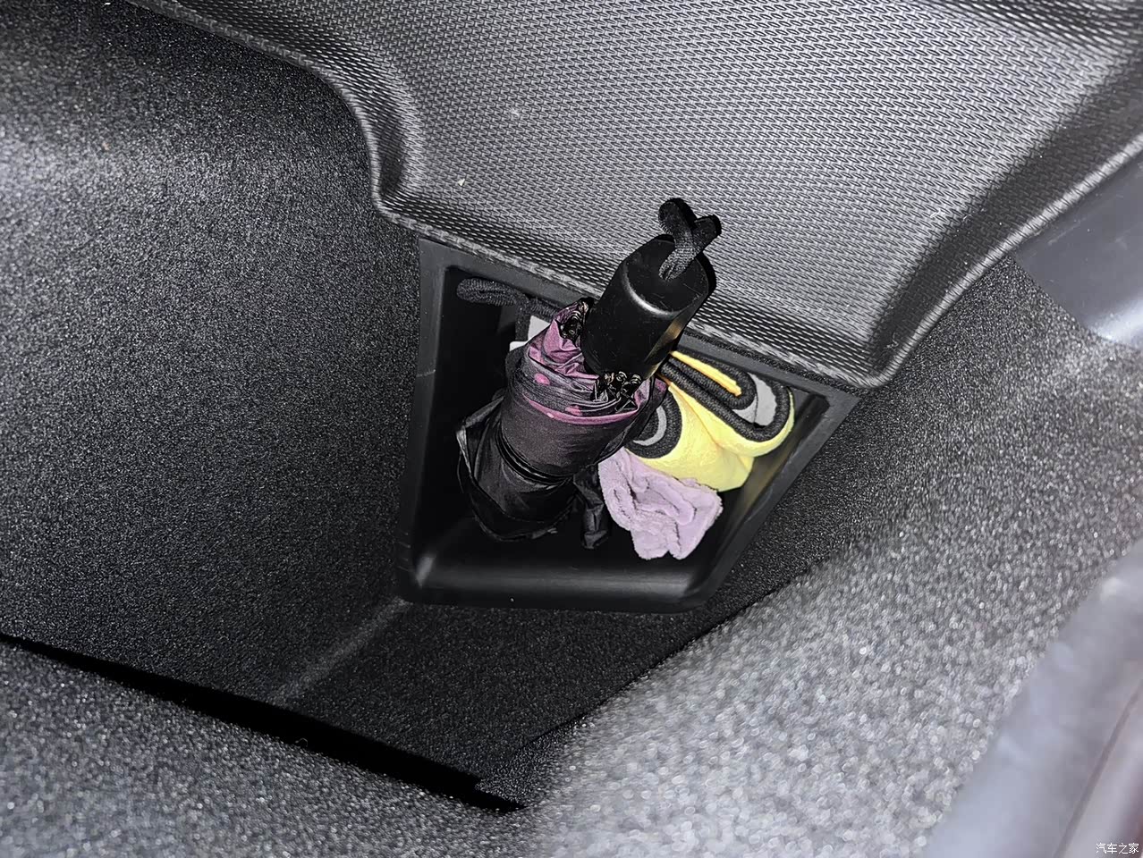 对于日常来说还是够用的,储物空间的角度来说,是很满足日常所用的,因为没有发动机,所以这台车是有前备箱的,可以放一些不常用的东西。然后车也没有配备胎,所以后备箱的挡板下面还有空间可以放东西。我最喜欢的是后备箱左侧有一个小凹槽,正好可以放兩伞,避免了雨伞在后备箱里乱滚的现象。有一次接父亲出院,大包小裹的也能放得下。
