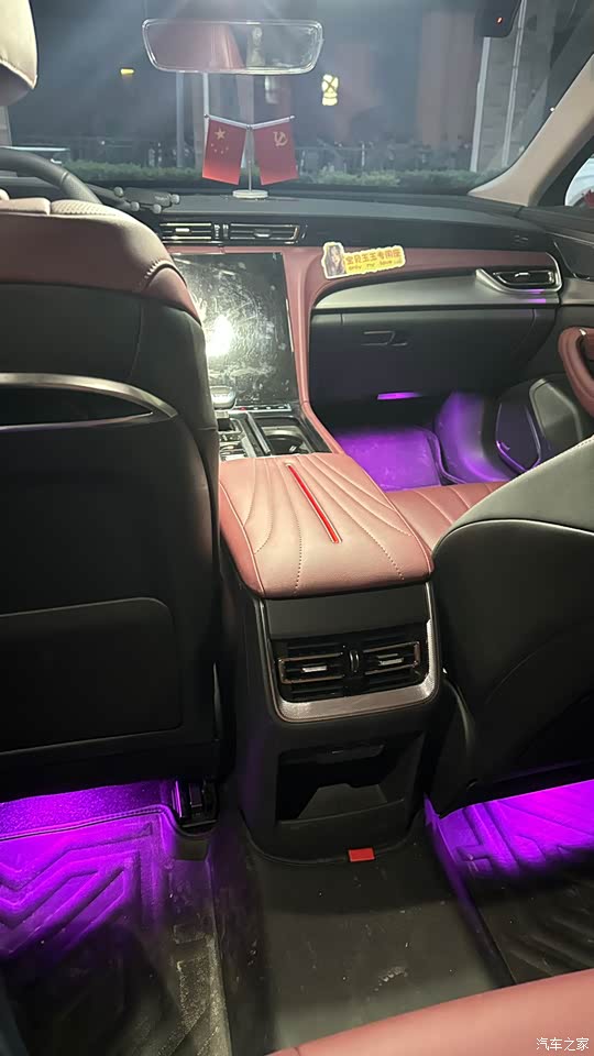 内饰我选的是红色,因为我觉得红色看起来高端大气,当时看黑色内饰就觉得挺普通的,直接就选红色,里面红旗元素满满,设计的不错,还有自带的氛围灯也挺好看的,还有座椅通风加热,PM2.5过滤效果也很好,音响用的是丹拿品牌非常给力