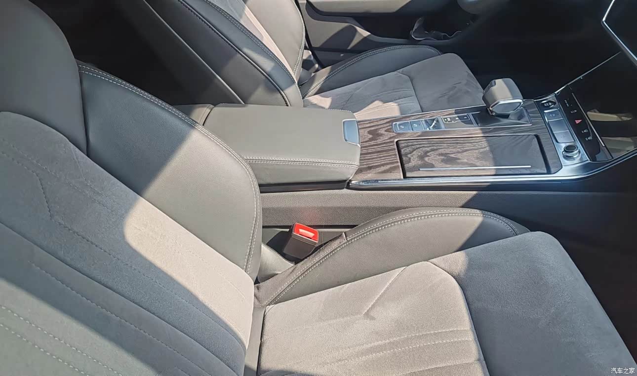 空间整体感觉是很满意的,因为主要是老板用车。第二排C位的空间肯定是要最大限度的保证包括舒适度也是要最大限度的保证的。 这里后面腿部空间是完全没有问题的。不太好的一点是后排中间还是有些凸起,既然价位到这里了,我觉得奥迪应该上的也是要上上了。 后排的扶手椅放下来。是个杯架加两个小的储物空间。如果说能加一个手机无线充电的地方就更好了。 后备箱的空间。横向上没有那么宽,因为它大概对齐了车门的宽度,主要是深度比较深。一般情况下里面就放一些酒,烟,茶叶之类的。也不会太过拥挤和杂乱。后备箱空间方方正正的,放在后面体体面面的挺不错的。