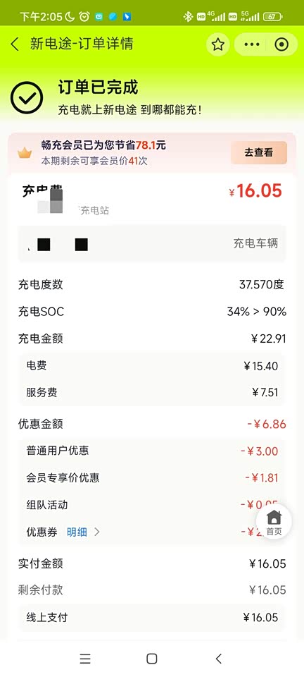 这车没有配置慢充口,只有快充,所以没有按家用充电桩,平常都是在外面充电桩充,日常出行充到90%电量就行了,基本充电时间半小时左右就可以搞定,如果要充满100%还是要1个小时左右,充满表显续航560,用车快半年了,国道及城市快速道路夏天续航基本能上500左右,成都这边冬天空调1档也有350左右吧,跑高速整体夏天450续航,冬天300以上的续航,这样的续航个人感觉也妥妥的够用了。