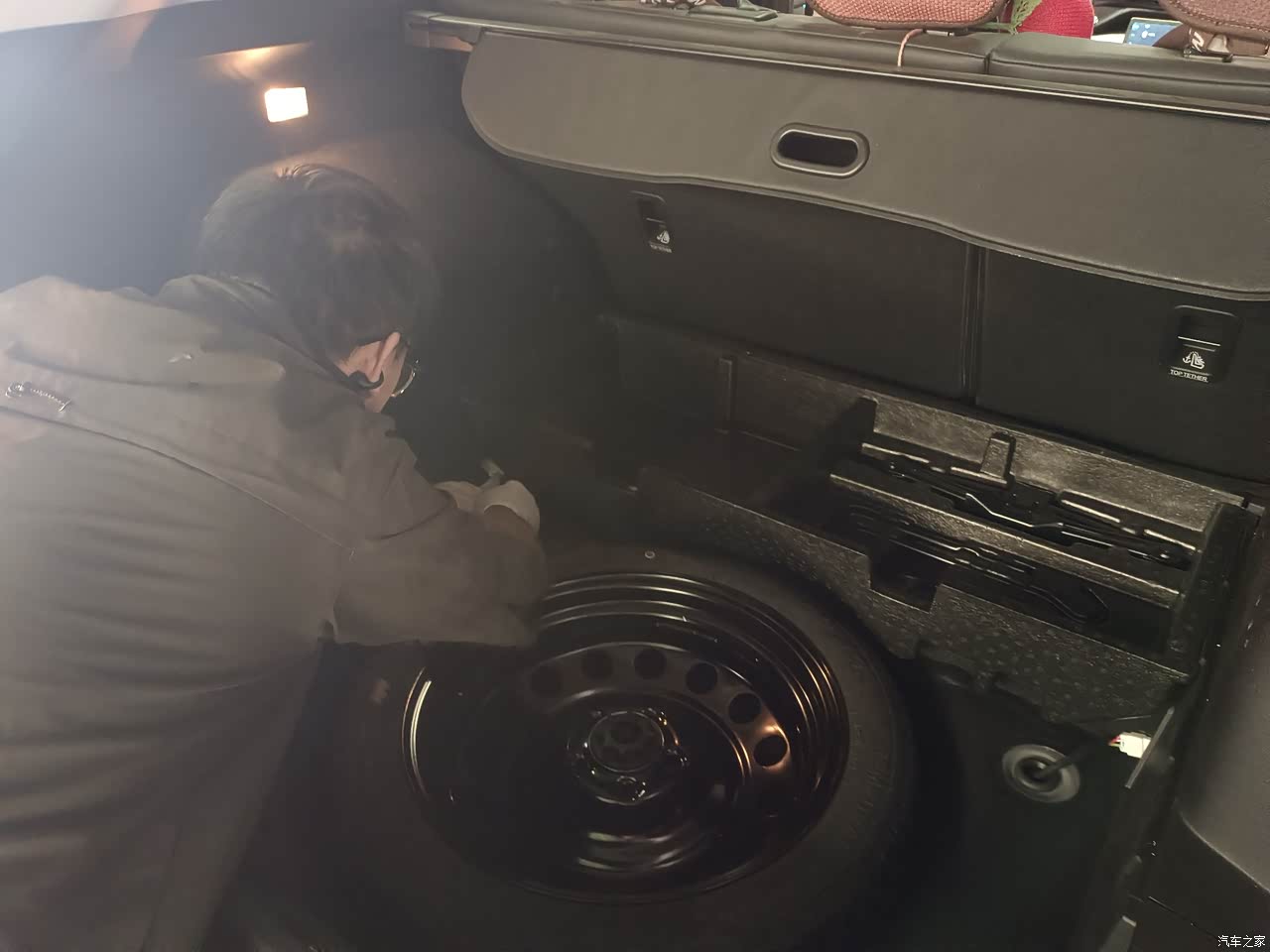 车后备箱地板是平的,备胎、反光背心、三脚架、千斤顶都用暗格规划在地板下面。后备箱隔板可以拆卸,外形数据决定了储物容积,我自驾游出去,一家三口所有行李至少三个大行李箱,放后面绰绰有余,还可以放两个二十寸小箱。储物空间总体,还算满意。