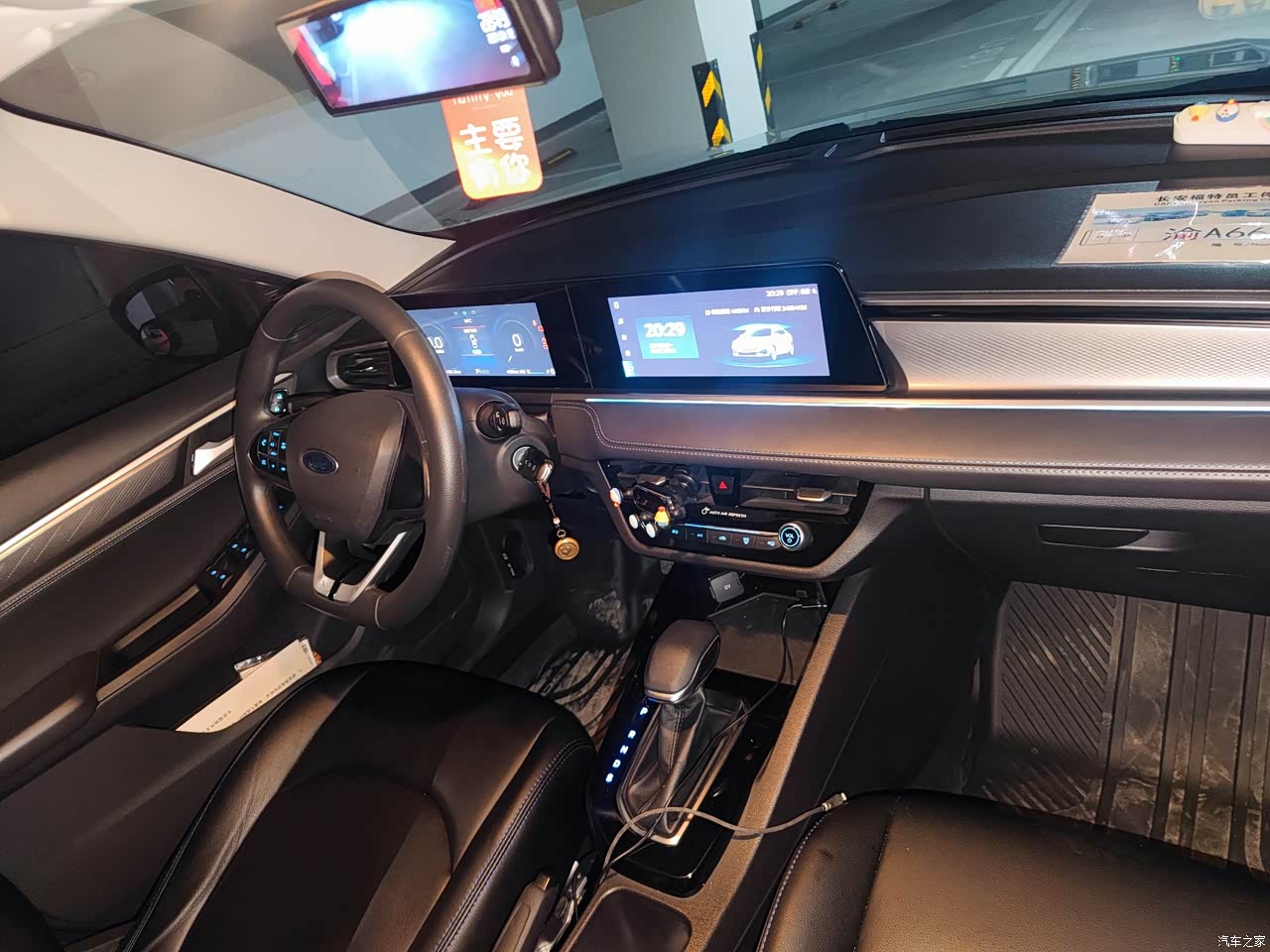 内饰的风格比较简约,深色的比较耐脏。车门门板上半部分也是采用硬塑料覆盖,我打算后期包一点布来提升年轻化氛围。双联屏看着很霸气,中控台加了一根蓝色的氛围灯带。