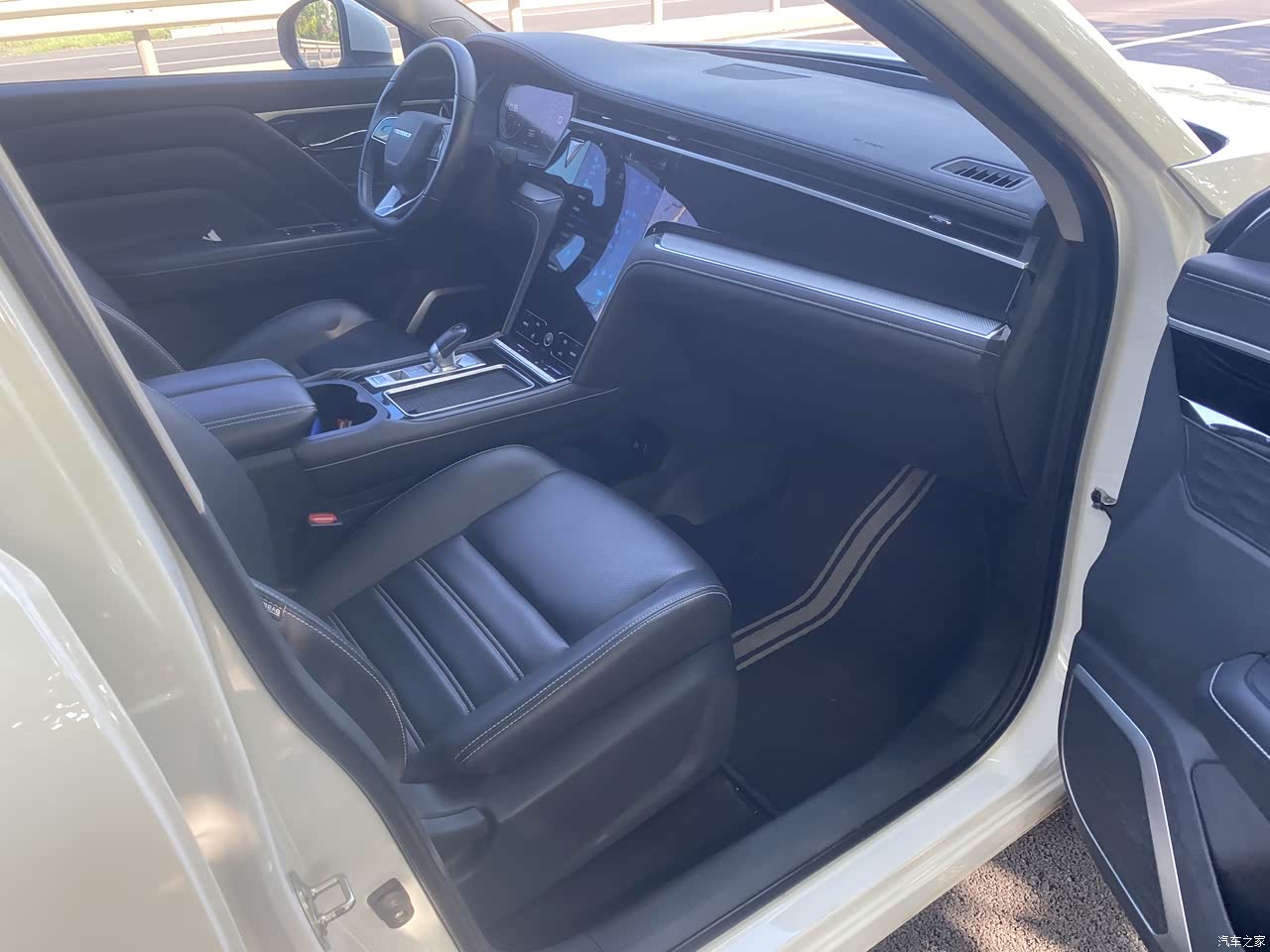 内饰部分,我还是比较喜欢黑色,白色车身黑色内饰,属于耐看型的吧,另外仪表台和门板的位置都有皮质包裹,很有造型感,同时冬季的化也没有那种塑料质感的感觉。