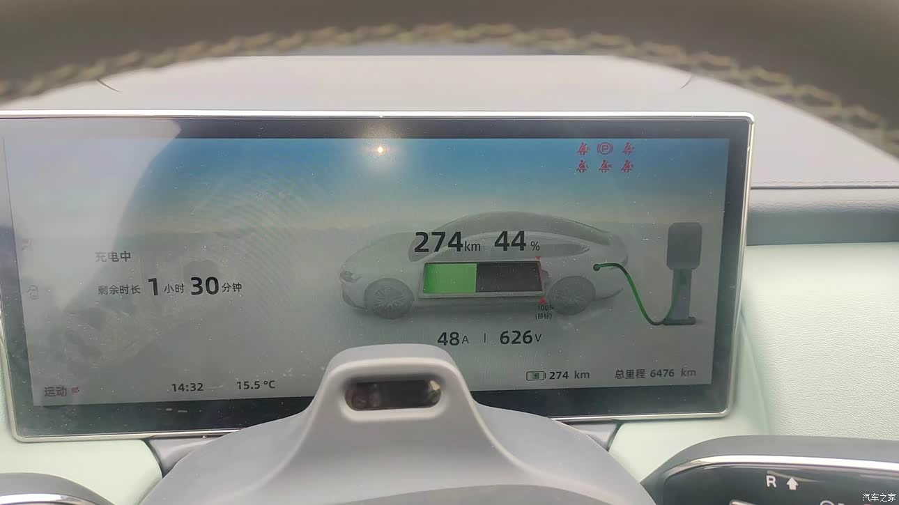 我这款是88度电的四驱版,为了给伙伴们详细的参考信息,我在今天充电之余拍了一下充电信息,现有还有44%电量,显示续航剩274公里,充到100%是610左右,并且我开启的是运动模式;显示充电时长还要1小时30分,可能和这个充电桩有很大的关系,电流只有48A,下次还是要找个电流100的,瞬间提速50分钟。