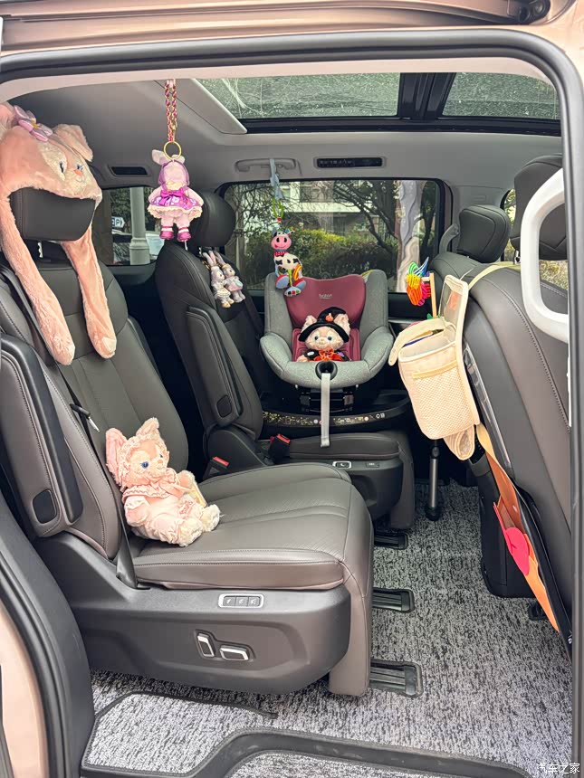 小朋友的东西再多也放得下,座椅方面,上汽大通MAXUS G70有6座车型和7座车型可选,其中7座车型是常见的2+2+3布局,而6座车型就比较有意思了,采用的是2+1+3座椅布局,其副驾驶拥有近2米超长滑轨,前后总行程980mm移动距离。简单来说,前排的副驾驶座椅既可以当副驾,也可以当第二排座椅,灵活度非常高。这样设计的好处是什么呢?比如放倒副驾驶位,二排会有个较大的储物空间。而将副驾驶位移动到第二排,就可以成为车内空间最大的位置,秒变女王座驾,拥有更舒适的躺姿。更值得一提的是,它还具备一键180度翻转功能(驾驶时此功能不支持),翻转后能与后排乘客面对面交流,也能更好的照顾坐在第二排的宝宝。当然,不管是7座布局,还是6座布局,都不影响到第三排空间的乘坐和空间感受。首先,上汽大通MAXUS G70拥有接近3米的轴距,同时由于工程师对车辆后悬挂和轮拱做了优化,因此能弱化对第三排乘坐空间的侵占。成年人坐在第三排是完全没有问题的,而且上汽大通MAXUS G70的第三排座椅坐垫前后齐宽,不像很多同级MPV为了进一步挤压第三排空间,把第三排座椅设计的跟坐小板凳一样难受。