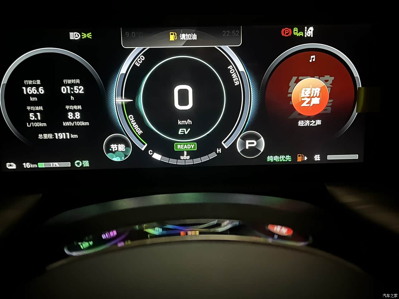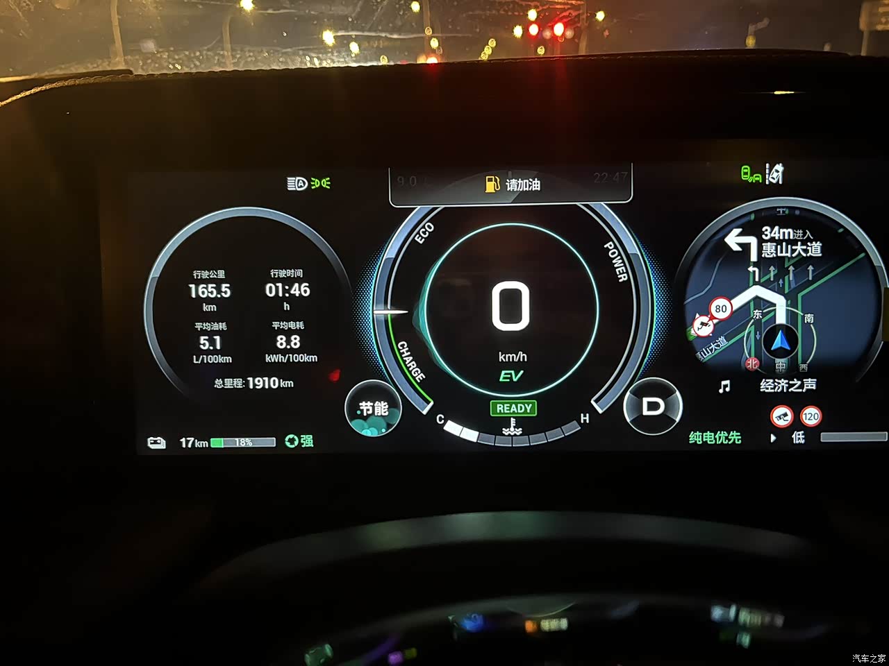 油表显示86KM,满电100,从南京到无锡跑了165KM,一开始全电跑,跑了电显还剩10%时换成智电模式驾驶,油表显示到20KM后就显示不了剩于公里了,中途电量又显示到23了,智电驾驶时还是充了10几度电的,这个油耗对于这么大的车来说应该算是非常不错的了吧…