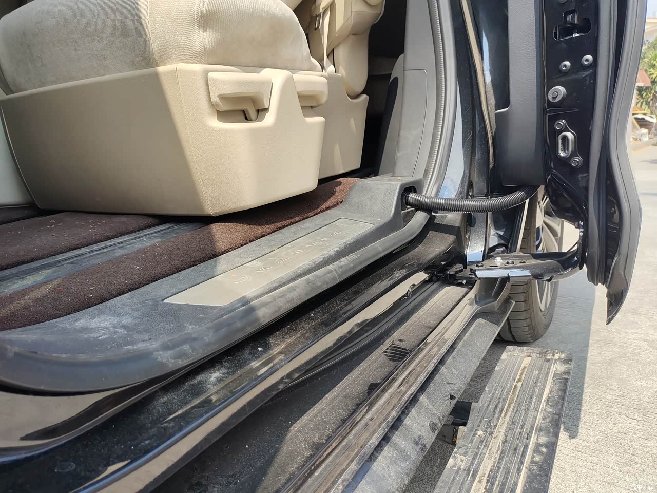 格瑞维亚从车上一步跨到地上,高度还是有些高的。成年人问题不大,但是如果有老人和小孩,那么还是需要考虑改善一下。我自己就是因为家里有老人又有小孩子,所以我加装了电动脚踏板。我选用的电动踏板长条形的,全车的都适用,不仅中后排可以踩踏,前排的上下车也可以。全车安装共左右一对,长度约2.5米左右。安装前,如果从座椅直接下车的话,车辆离地间隙约48cm,成年人一步到位也比较困难,老人小孩就更没法实现,通常要拉着侧把手慢慢下车。安装了以后,开门时,电动踏板自动伸出来,在中间给了一个楼梯模样,踏板离地间隙约为18cm,从座椅下车,踩在踏板上可以实现一步到位。安装后,单边踏板可同时承载3个成年人的重量。有的人问我,这种加装了会不会影响车宽?实际上是不影响的,因为只有开门的时候才会伸出来,行车的时候是缩进去的,不影响行车。
