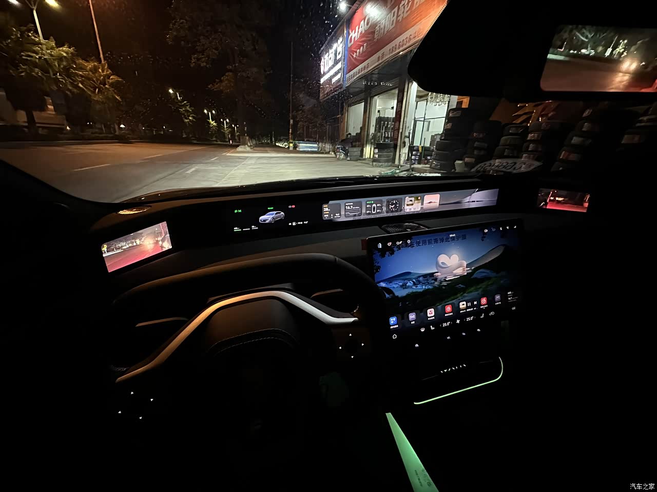 官方提供的内饰仅用三种选择,如果能多出几种就更好了。紫白内饰是个人最喜欢的,真的非常好看而且并不需要另外花钱选装。但是考虑到平时的用车环境,怕白色容易脏还是无奈放弃,最终还是选择了更为耐脏的黑色内饰。然后内饰整体设计加上氛围灯的存在,整体氛围感拉满了,非常漂亮。但是远端屏目前只能显示一下基础的卡片信息,显得有点鸡肋,希望后期厂商能通过ota增加远端屏的功能。