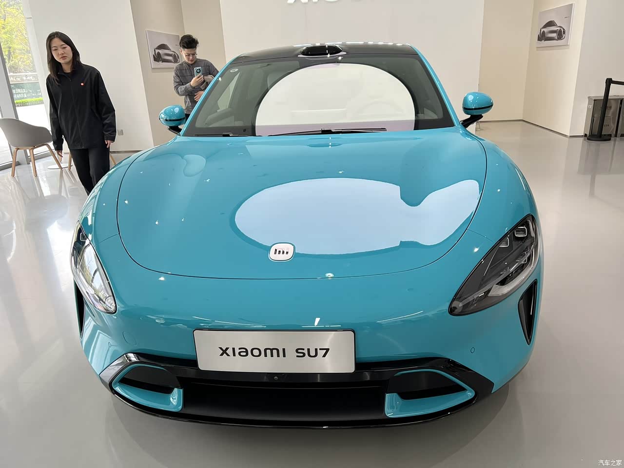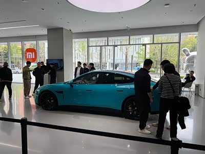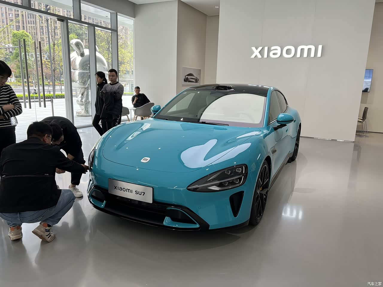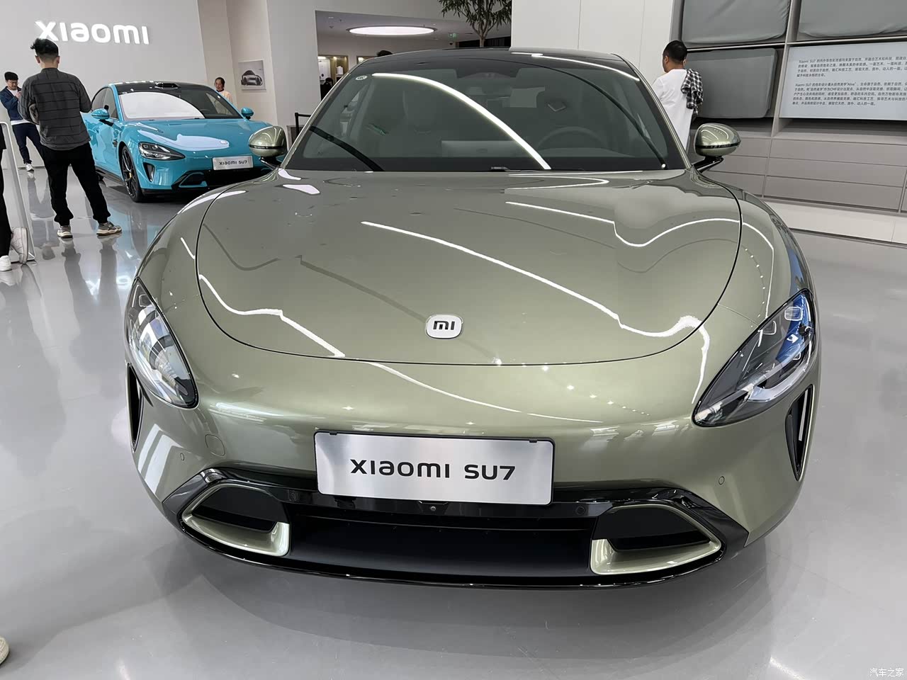 小米虽然也是第一次造车,车后写着北京小米,成都万象城的小米旗舰店展厅目前也只有两台车,低配尾标就是SU7,没有红色的max。其中蓝色车漆台应该是顶配尾标是SU7 MAX,MAX几个字还是红色很显眼。而且这个蓝色车漆实物比图片看起来更好看一些。小米汽车一出来的时候,大家讨论最多的应该就是它的车灯,一改市面上的眯眯眼大灯,炯炯有神真好看啊,而且大灯分割出一个小字,然后内部远近光灯又平畴出一个米字,组合成小米字样,充满了设计感,不错!车辆做工光看外表,相当不错,令人期待!