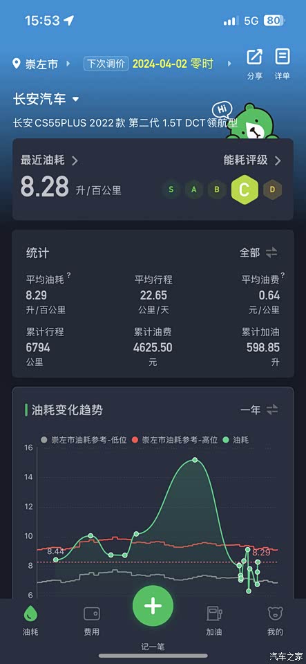 因为平时车用得少!大部分都是跑高速和国道所以油耗还行!就是经常原地热车所以油耗偏高了一丢丢!