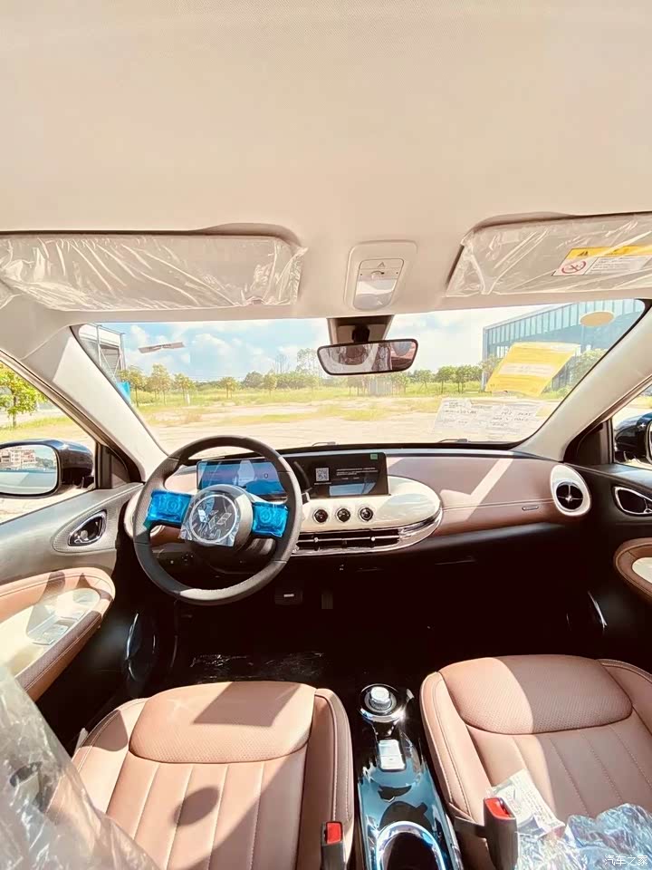 它的内饰是皮质座椅,坐起来舒适感挺好的,而且也比较好打理。它有浅色和黑色两个配色,都是有复古的感觉,特别是中岛台,很可爱,设计得很有特点。