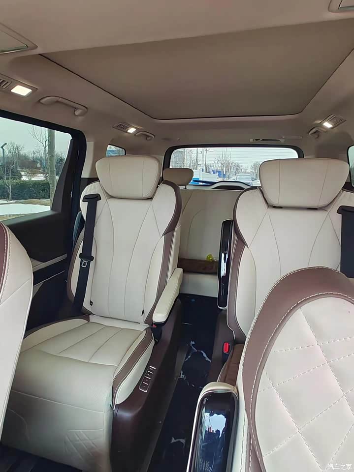 内饰颜色搭配温馨,氛围灯可以营造出居家氛围,相较于其他MPV,商务属性较弱一点。中控屏幕较大,空调出风口与档位设计整洁。整个车内的布局很合理,车内材质及做工上乘,不仅座椅,就连方向盘手感都非常好,使车内显得格外简洁。