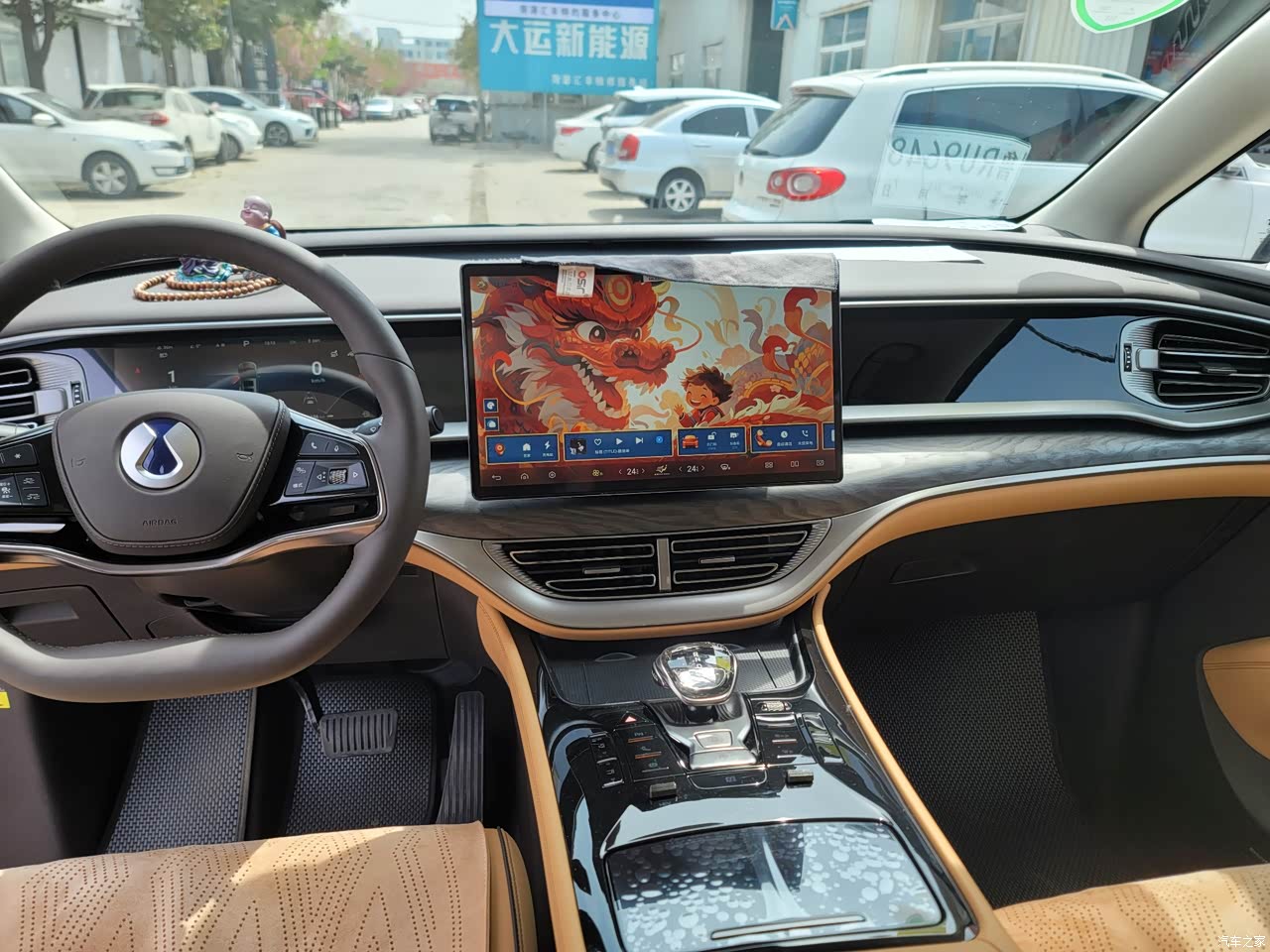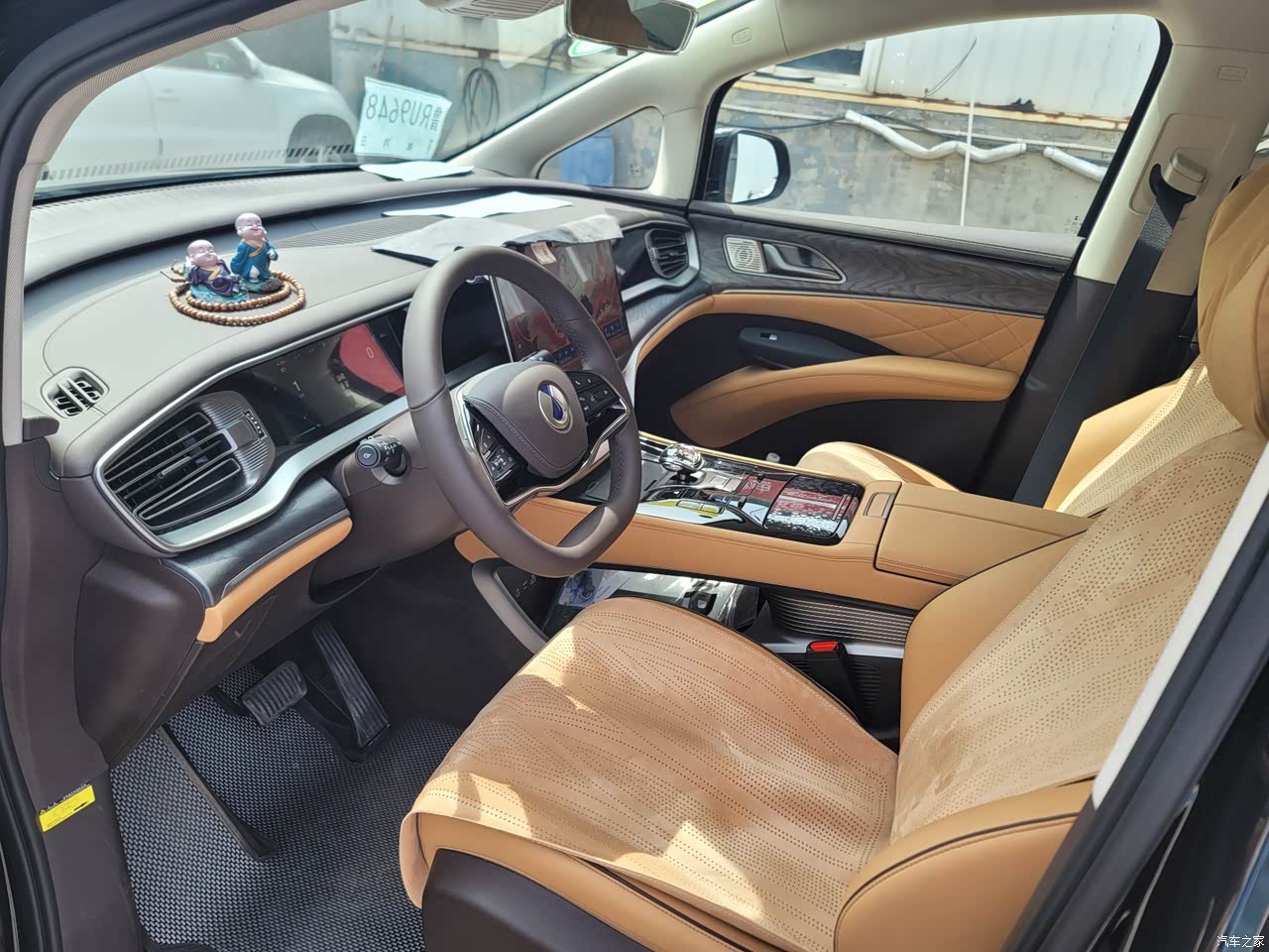 内饰上做工用料对得起这个价格,整个座舱偏向暖色,配上真皮座椅,木制的饰板还有环抱式的前仓,营造的很有豪华感,空调出风口还增加了亮条,四门和后尾门还新增了金属的踏板,显得更有质感。中控台上有个15.6的悬浮大屏,加上驾驶位的仪表盘,很有科技感。