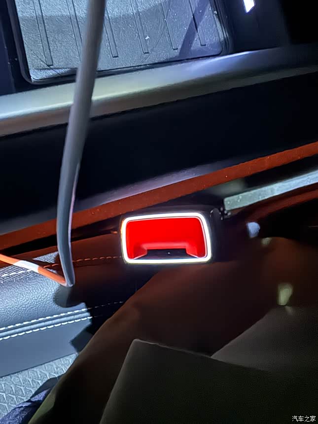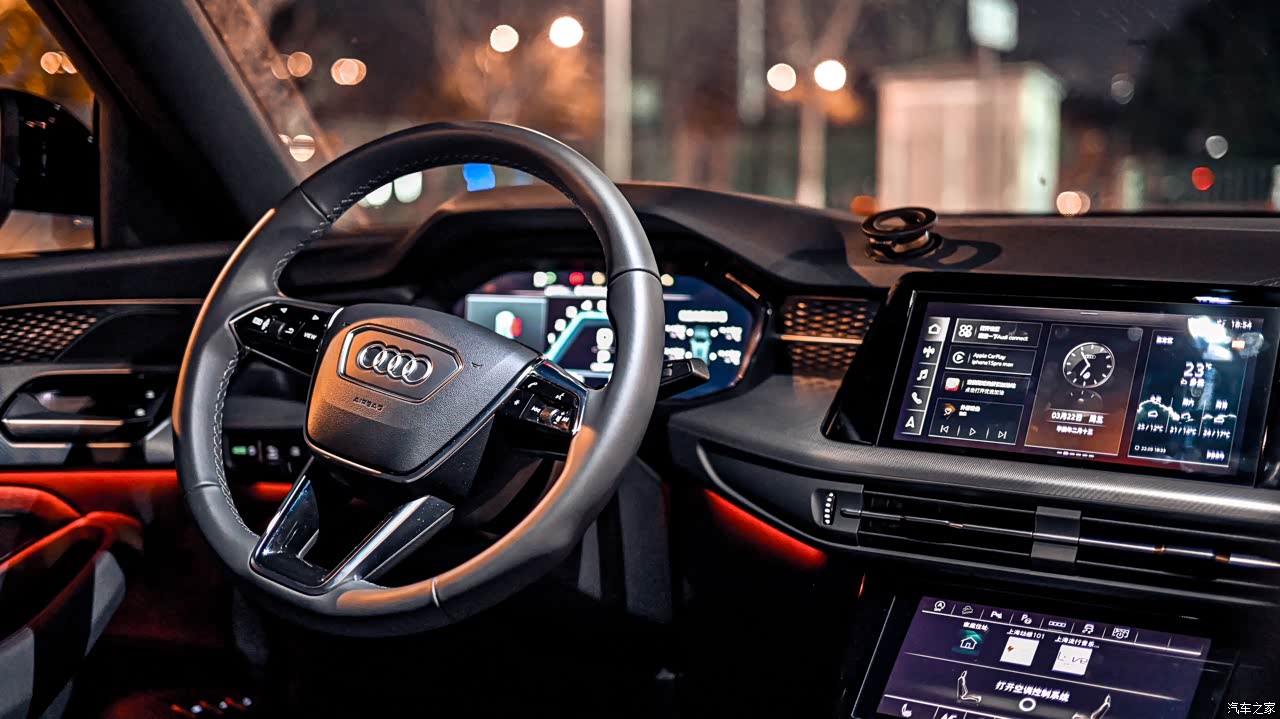 奥迪车子的内饰千篇一律, 基本都是这样子的,Q6好在有个三联屏,看上去还高级一点,我比较意外的是安全带卡扣上还有灯带,心里想着奥迪果然是玩灯的,这里都有灯,还有奥迪的飞机档把还是很好看的 四门投影全都有奥迪四环的logo,高级感一下子就拉满了 30色的气氛灯可以随着音乐 变换颜色,KTV效果显著,哈哈