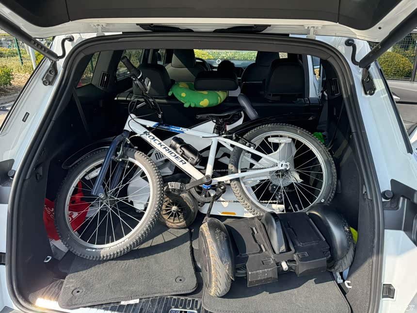 因为是七座的版本第二排我儿子玩累了可以直接横着睡上面,五座状态下的后备箱可以放进九号卡丁车,和一辆自行车,其他的还可以放。这个车子最大的优势就是大,非常大,真的好大。