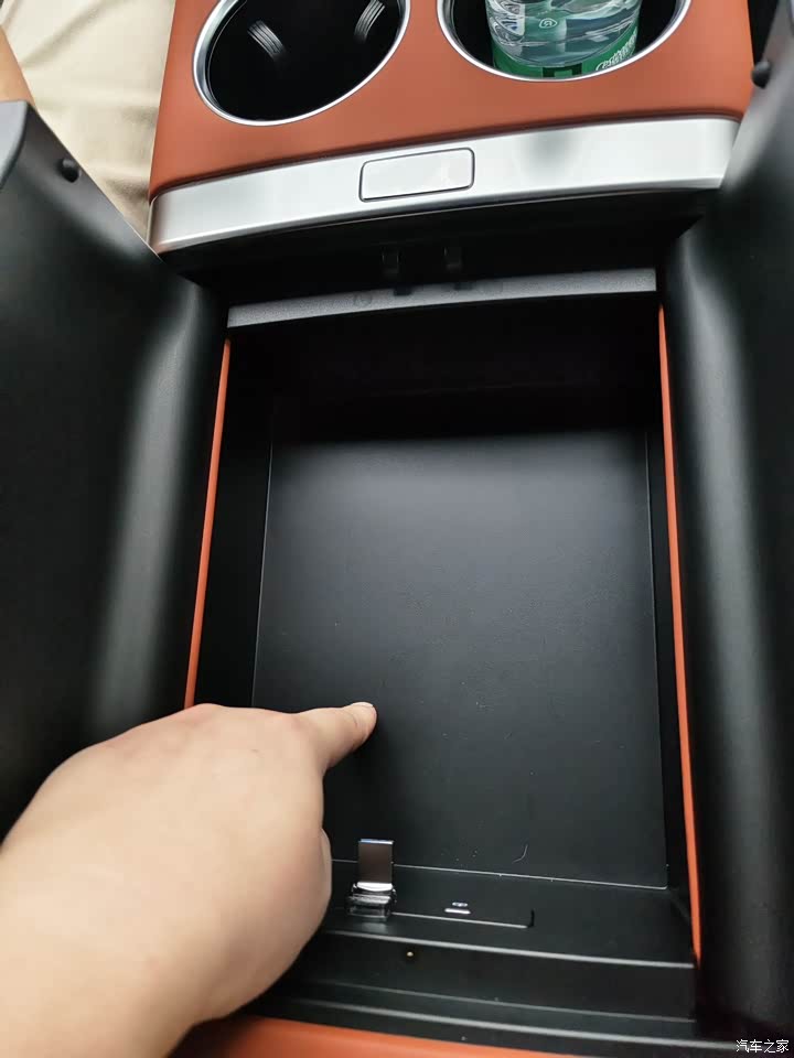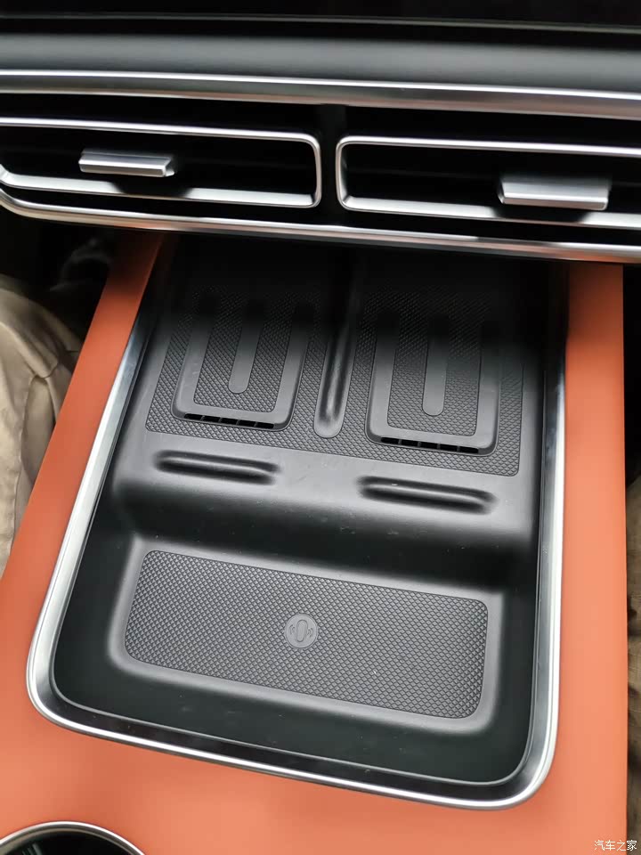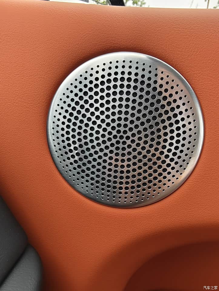 内饰看起来和以前的大哥车型也没什么太大的区别,前排都是中控大屏加副驾娱乐屏的连屏组合。有冰箱,冰箱可以放4瓶水。MAX版中控扶手箱不剩,应该是冰箱占用了空间。50瓦的无线充电器也是标配。发现和之前的车型的小区别是,金属喇叭罩从光面变成了拉丝,质感更好了。
