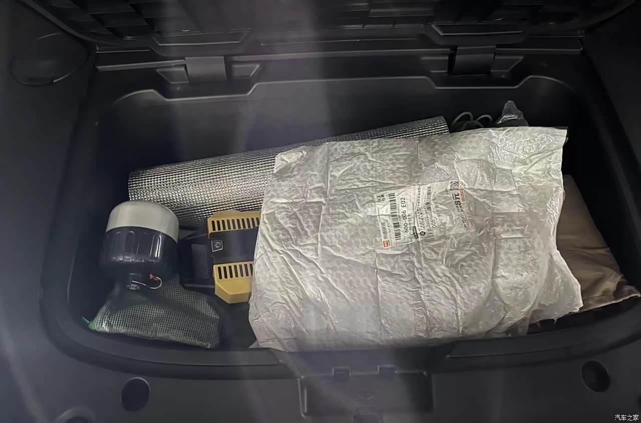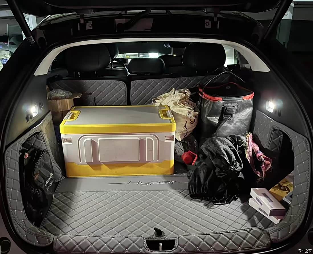车内空间超大,前备箱能放下帐篷天幕尾帐之类的东西。后备箱可以放折叠椅,蛋卷桌,收纳箱,两边有下沉的格,放些琐碎物件,底下还有个空间,放了放电枪,天幕支撑杆之类比较重又不常用的东西,基本一家几口出去露营的装备完全放下是没问题的了。