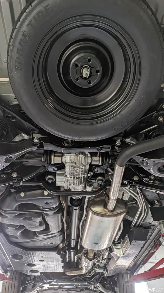 后备箱打掀开有很大空间,打开内侧里头内盖有千斤顶、灭火器,此次旅游放了充气泵、拖车绳、应急起动电源和自救工具。