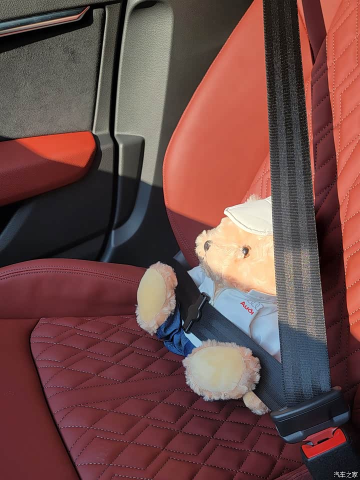 内饰全真皮,用料特别好,黑武士版本配置的是运动座椅,当时买黑武士有一半的原因是红内+运动座椅。损失了点乘坐舒适性,反正好看就完事了,副驾坐着奥迪小熊天天陪伴我安全出行。