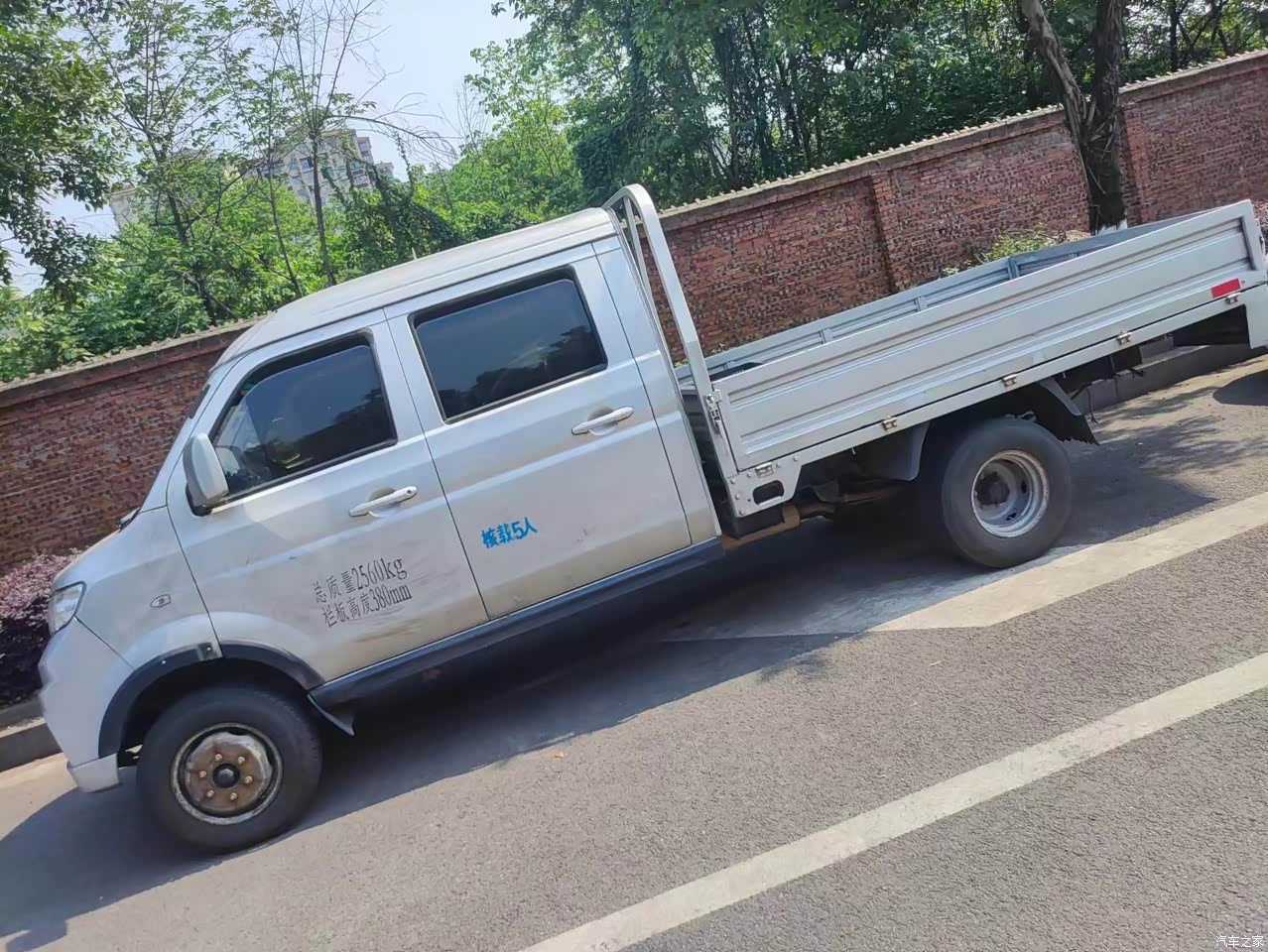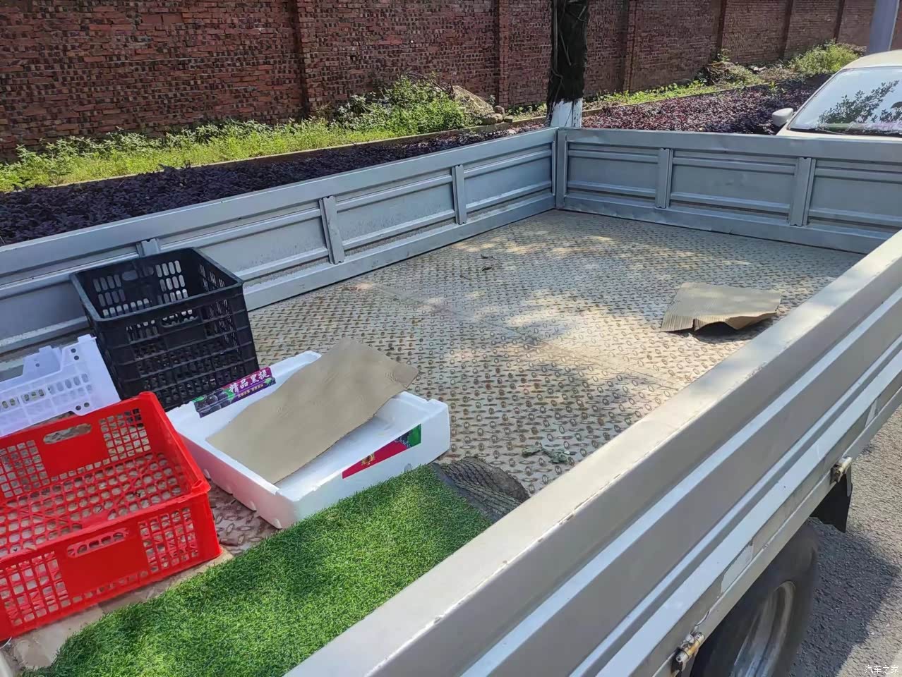 2米多的货箱,能容纳我装的水果蔬菜,而且两边栏板都可以放下来,卸载货物就很方便,加上前面双排坐,坐五个人都轻松。