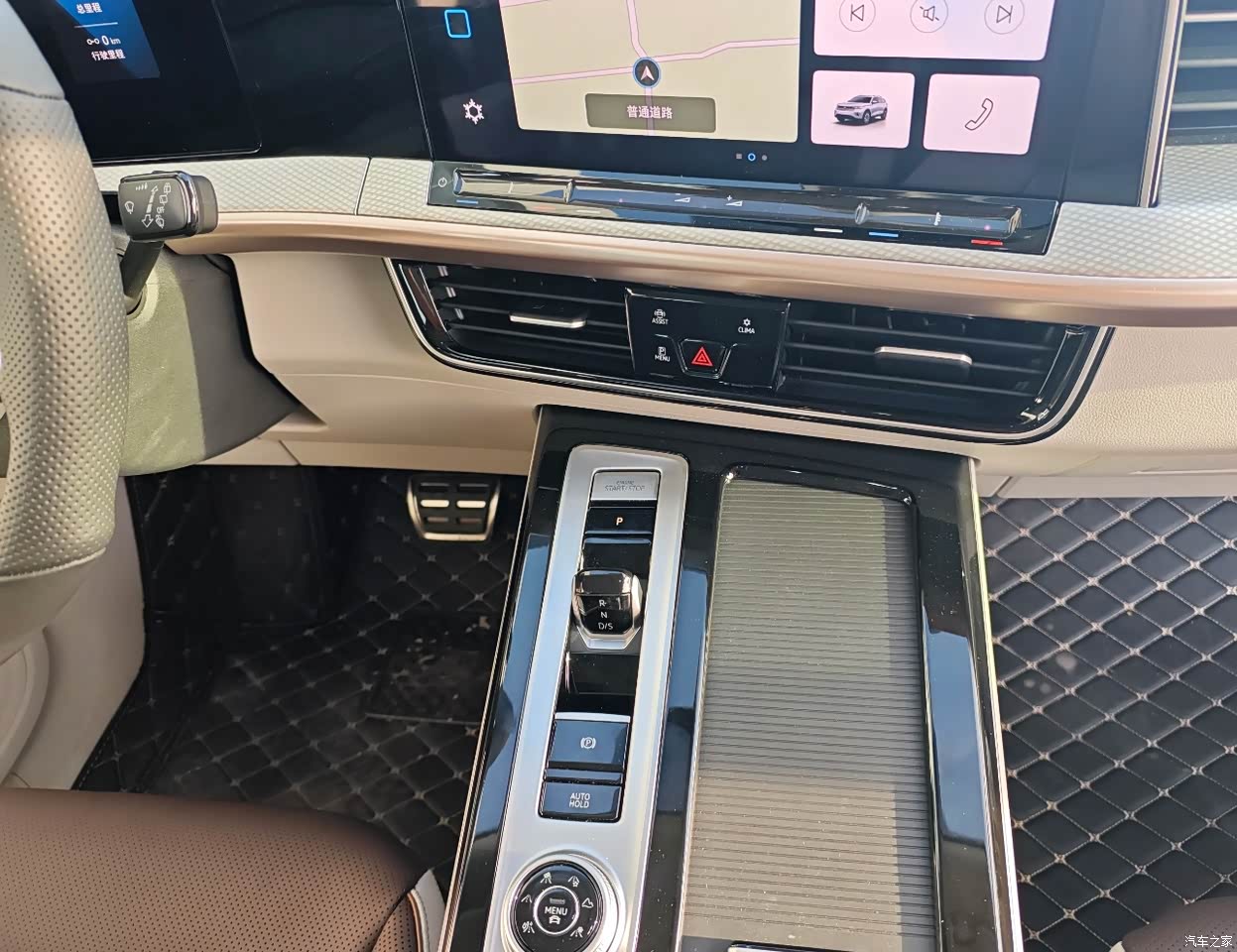 内饰的配色比较好看,是棕色和白色拼的,看起来比较年轻化。内饰呢比较有设计感,用了类似大连屏的设计,看起来很上档次。中控位置因为把档吧设计的很小,而且把中控储物空间都设计上了推拉的设计所以看上去非常整洁。方向盘上的操作是触摸的,感觉不如实体按键用起来方便。