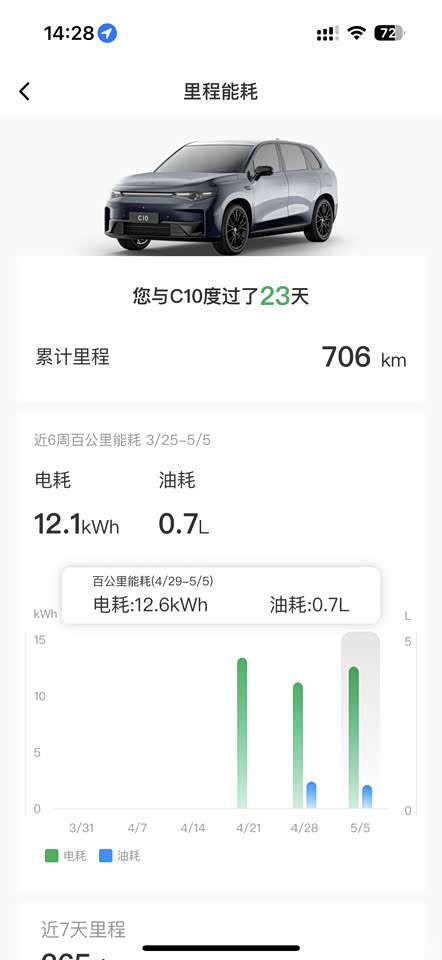 目前主要行驶在佛山,除了冬季基本都要开空调的,目前电耗12.5油耗7.6