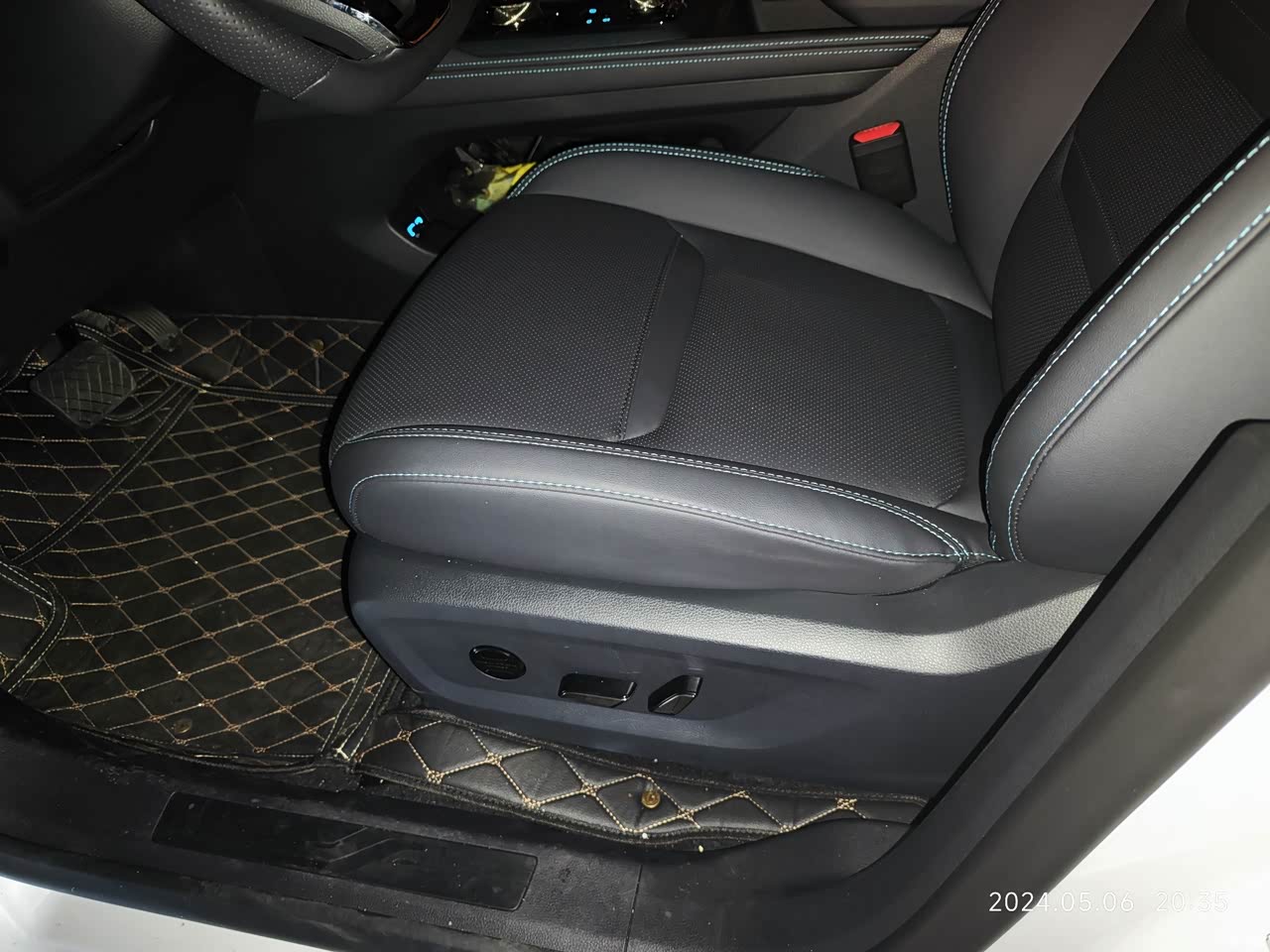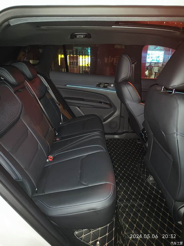 中控台做工比较细腻,大屏幕挺漂亮的。 当初车展第一次见面也是因为拉开车门的那瞬间没有异味,才停留下来了解,可能是展车,透过气的原因吧。坐椅带打孔设计,扶手皮质细腻,面板点缀蓝色星点,晚上行车带氛围灯。