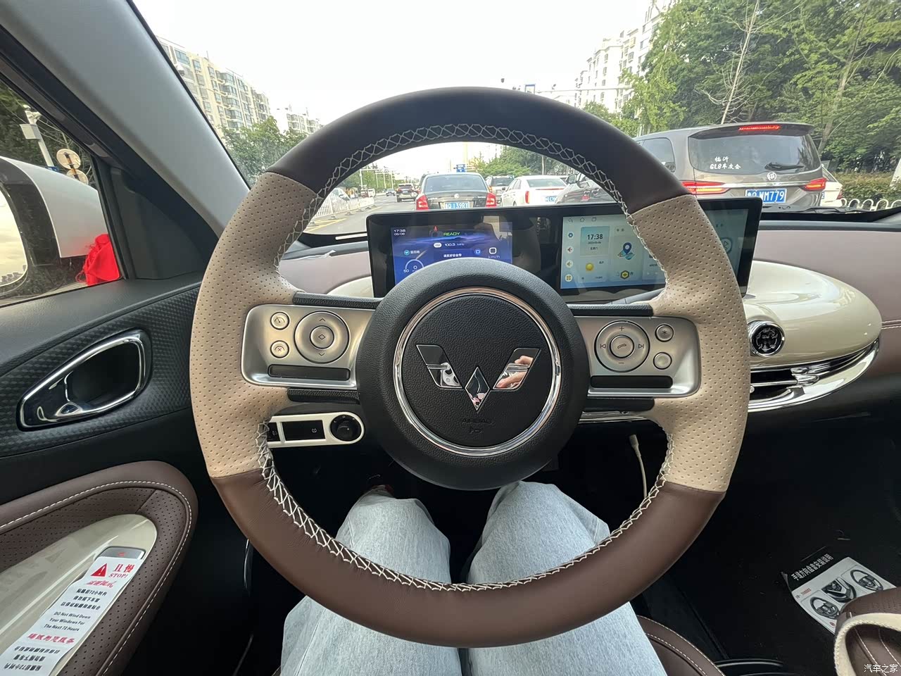内饰颜色配色非常好,做工也很好,而且开了快一年了,也没有严重的磨损,然后座位很柔软,质感也不错。中控台的设计感觉也非常好。很多零配件看起来也不会太廉价,而且有很多啊100,000以下的电车内部都是黑塑料感非常严重的,而这款车就不会,我也是看中了这款车,没有黑塑料感。而且网上还有非常多的配饰啊,可供选择。图二的方向盘是我自己在网上订购的DIY方向盘皮套,让自己缝上去的和车里的颜色很搭,而且车里的感觉会迅速上一个档次。