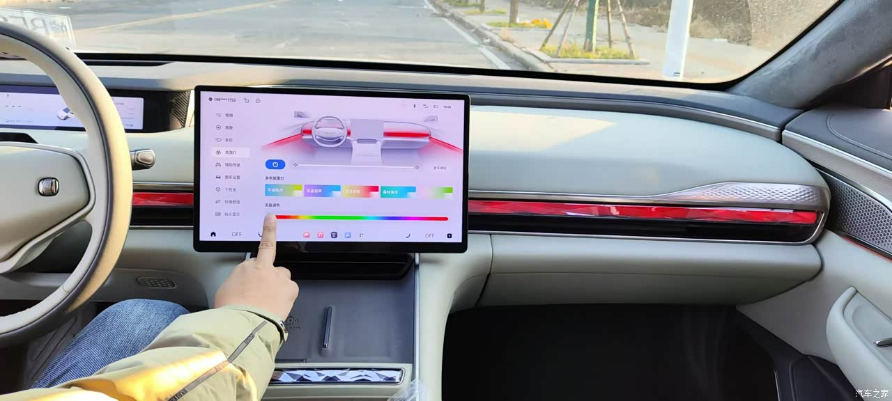 内饰方面,实体按键挺少的,比较简约吧,一块仪表盘,很贴合人的眼睛,加上一块悬浮式的大屏幕,功能都集中在这里,语音唤醒等可以识别用户指令,反应也还不错,没有卡顿现象,最让我喜欢的就是副驾驶的灯带,很亮眼不仅可以音乐律动,还可以改变颜色,内饰用料方面挺好,基本上没有新车的异味,零甲醛座舱还是值得信赖