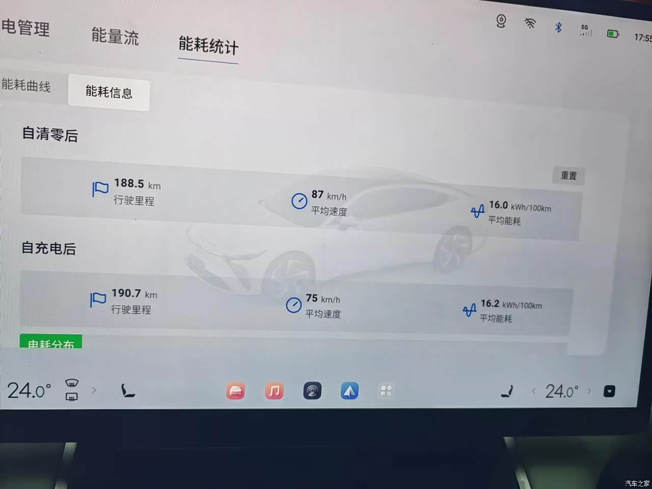 续航方面来说的话,这个电耗也是分路段的,拥堵和非拥堵路段,跑的码数都有关系,平均速度87,显示电耗是16.0kwh