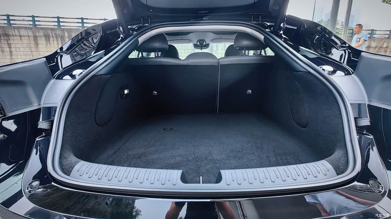 前排空间还是很宽敞的,主驾驶位以我185的身高调整好位置后,依然有很不错的头部空间和驾驶空位,坐起来还是蛮宽敞舒适的。至于后排空间,虽然智己L6轴距有2950mm,后排也算宽敞,但因为是轿跑,与我现在的小鹏P5后排空间比起来,感觉并没有想象的那么宽敞。185个头的我坐在后排,头部空间有一拳左右的距离,膝部空间有两拳左右的距离,表现良好。后备箱空间如图所示,掀背式尾门设计,取拿货物比较方便,但是宽度不够是一个硬伤。