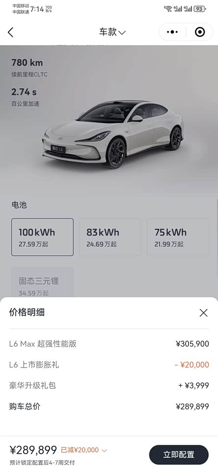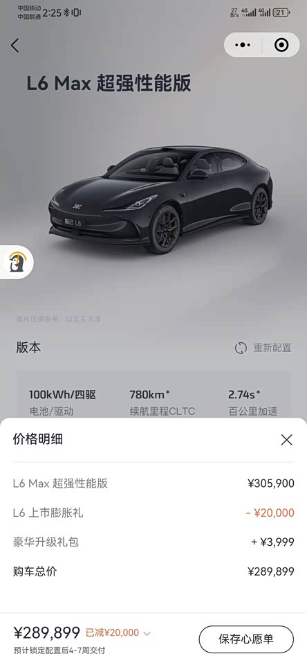 L6Max超强性能版本厂商指导价30.59万元,上市膨胀礼2万元,实际售价28.59万元。豪华升级礼包加价3999元,包含了全场景智慧空气悬架,毫秒级全路况电控动态阻尼调节系统,购车总价28.99万。半幅型方向盘限时免费,推荐加装。保险首年6000元左右,综合下来30万左右落地,我觉得价格比较合适。性价比上来说,20-30万的区间,这款车还真的是很能打的。如果对动力需求没这么高,也可以买中低配的版式,性价比更高,单电机加速在城区开以及日常家用完全足够了。