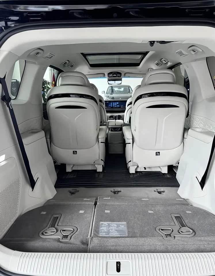 二排座椅推到前面,第三排放倒,可以实现据说1.8米的大床,展示了一下还真是,要是不坐满7个人的情况下,调成这种布局放个气垫床,孩子可以在后面睡觉