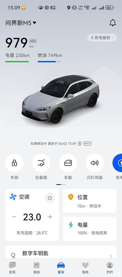 因为我的问界新M5是增程版本,所以在深圳南方满电满油1000公里以上没什么问题。日常因为小区车库有充电桩,我基本都是充电的,我这个新M5 RS版本CLTC纯电续航是225KM,除掉20%就需要启动增程器,感觉可以跑150-170公里,市区上下班还是足够了。