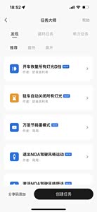 理想还有一个功能是非常好用的,可以解决很多用车任务可以自动执行,那就是任务大师这个功能,就像编程一样,任务大师能够自由定义功能组合,实现座椅,坐姿,驾驶,门窗,灯光,导航,语音,蓝牙,应用,配件等等大部分的领域的功能及执行动作以及任务条件这些都能联动,可以设定组合条件,自动化地同时触发多个执行动作,来实现特定场景的个性化需求,自己可以设定自己想要的任务,也可以使用最近热门的分享码来生成,总之能满足所有 的条件要求来自动执行任务及动作。 打个比方吧,像座椅按摩和语音提醒都可以设定好任务大师,行车多长时间就可以自动开启座椅按摩,行车多长时间让理想同学跟你互动,设定好任务大师后,车机就会按照 条件自动运行,可以说非常方便和智能,不会因为自己忘记而忘记,理想的任务大师真的可以点赞,太多功能可以实现任务大师的设定和自动操作,用了真心好。