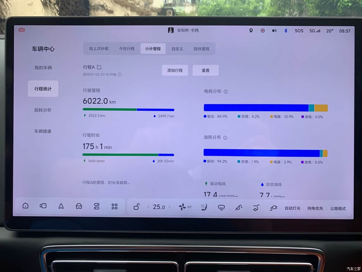 一共行驶了6022公里,刚看了最新的APP数据,这6022公里行程,纯电驱动电耗17.4kwh/100kw,油耗是7.7/100KM ,用油全部是春节回老家开长途使用,上下班全部用的纯电。跑长途高周燃油优先,基本120码的速度,全程空调,油耗大概在7.5-8个油之间,燃油优先电量会保持在80%,对于一台大车来讲电耗和油耗我是满意的。
