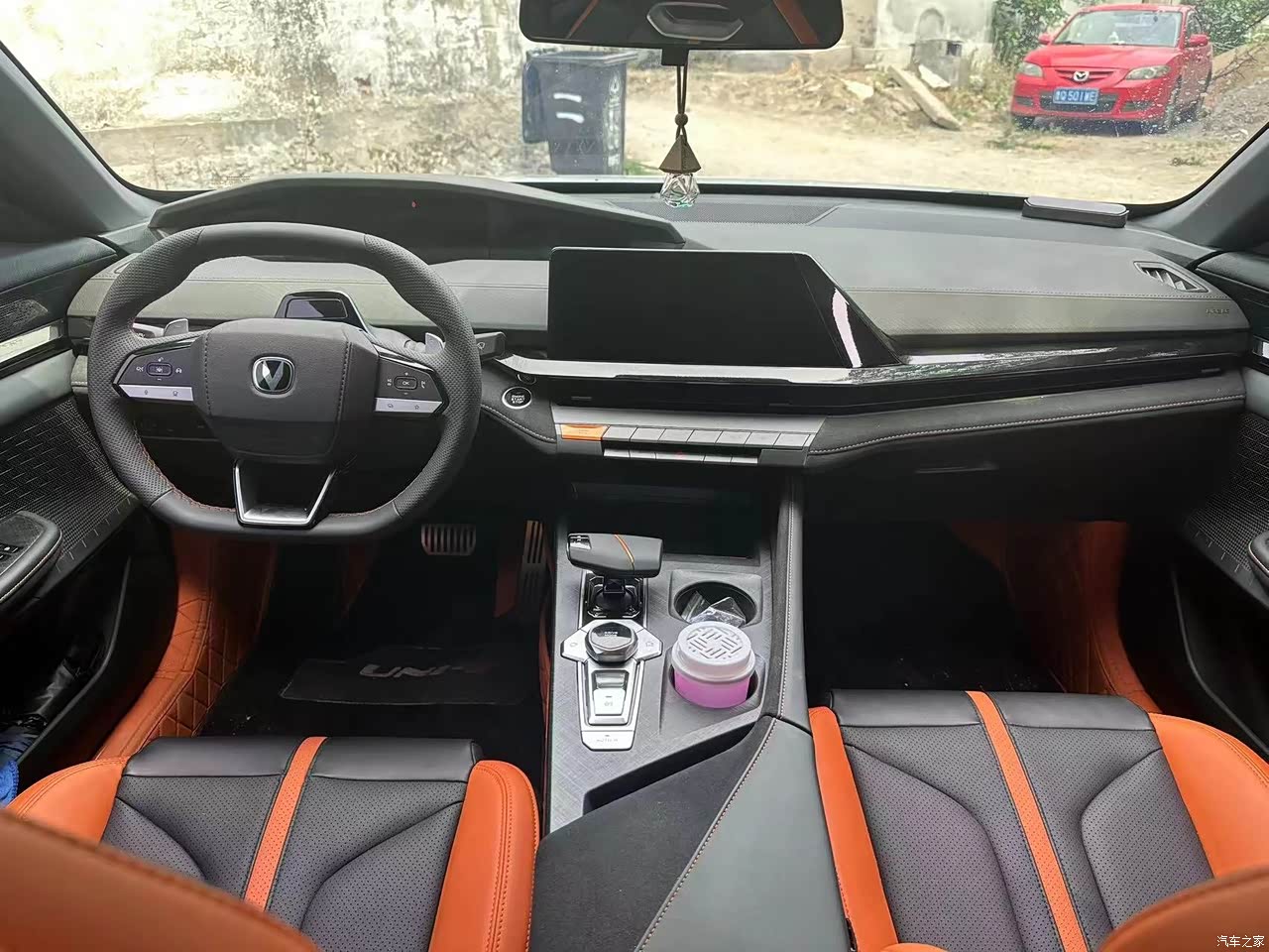 整个内饰设计简约而不失时尚感,黑色和橙色作为主色调,这种对比鲜明的色彩搭配不仅显得时尚而富有活力,还为车内空间增添了层次感和现代感; 皮革材质的座椅,既舒适又显得高端大气。这种材质不仅触感舒适,还能提升车内的整体质感; 中控台上方配备了大尺寸的液晶显示屏,这大大提升了驾驶者的信息获取效率,使驾驶更加便捷和安全,平底方向盘的设计不仅符合现代审美,而且具有运动感。多功能按键的加入也使得驾驶者可以更加轻松地控制车辆的各种功能。