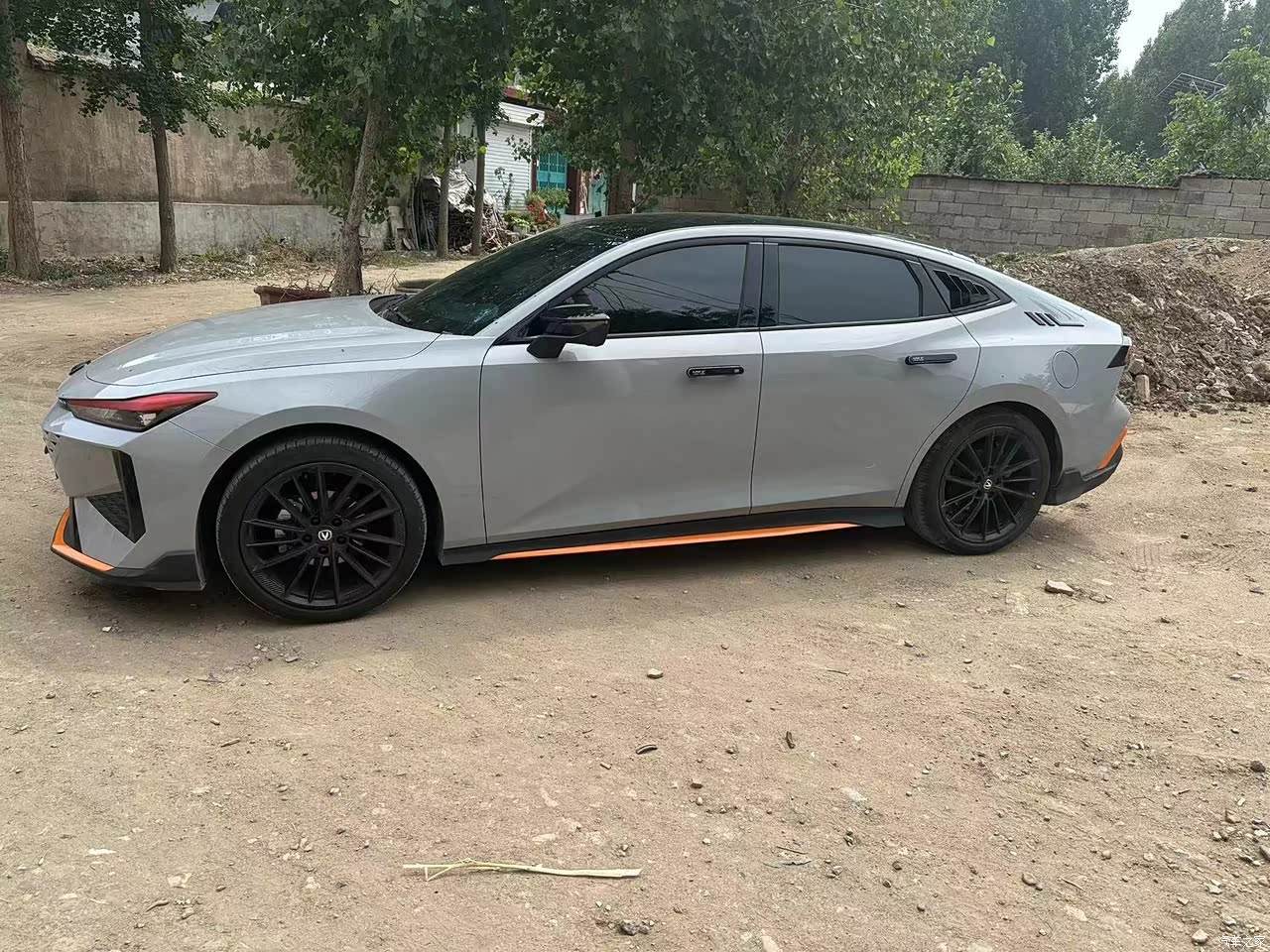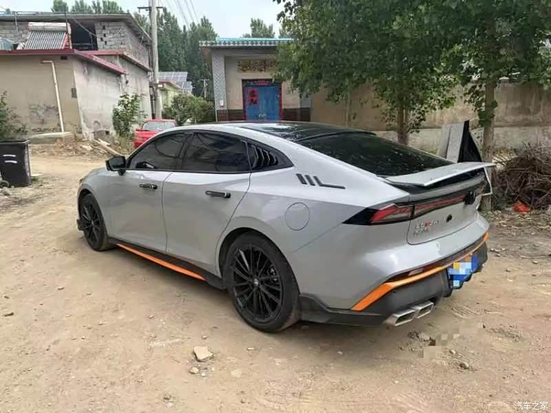 车身颜色为银灰色,带有橙色装饰线条,增加了车辆的活力与时尚感。 车头前脸格栅自带矢量三角形元素,在原车的基础上进行了改装,R标买的原厂改件,logo标志做了全黑的处理,大灯进行了局部灯贴膜,使整车气质更显个性动感,更符合年轻人的审美; 隐藏式智慧迎宾门把手贴了贴纸与灵动车身曲面完美融合,呈现出纯粹的光影效果,同时让修长的车体看上去更显飘逸;车身侧面线条流畅,采用了溜背设计并加装了一些修饰品,整体呈现出蓄势待发的姿态,运动感十足。 运动掀背尾门设计,兼具运动美学与实用艺术量子燧穿尾灯和双边双出运动排气设计,搭配同级独有的智能电动尾翼,不仅提升了运动感,还增加了鲜明的辨识度。