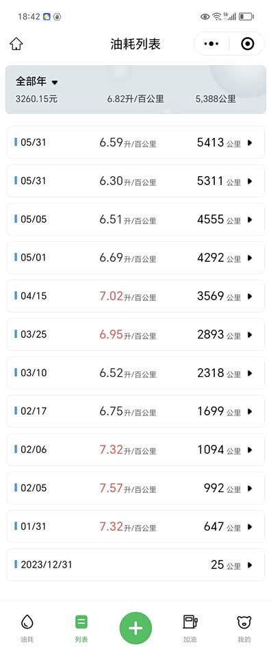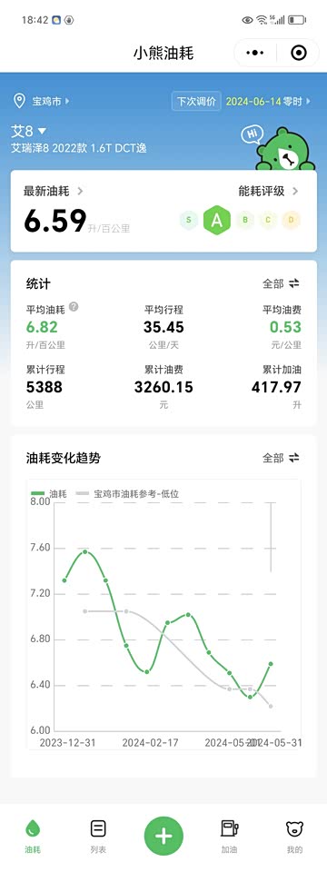 目前最佳油耗,首保前没下过6.3,保完最低来到国道5.5(表显)。 一直用小熊油耗记录,如图,最低6.3。 国道省道跑的多,高速市区较少,表显油耗有信心搞到5以内,小熊记录能下6