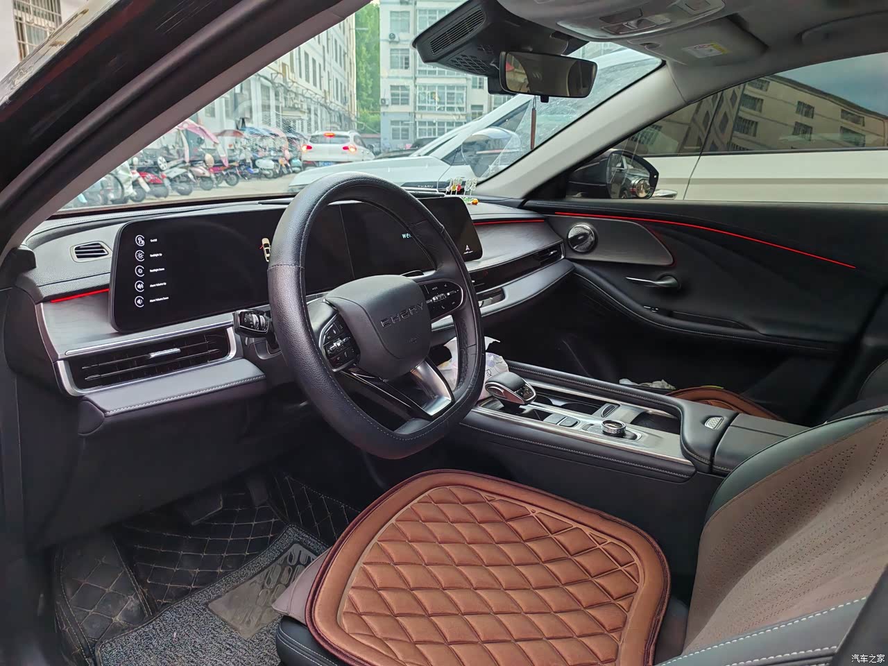 全车大面积软包,皮质座椅很上档次,舒适度不错 夜晚行车开启氛围灯,很带感,美中不足没有呼吸律动,归根到底钱不到位