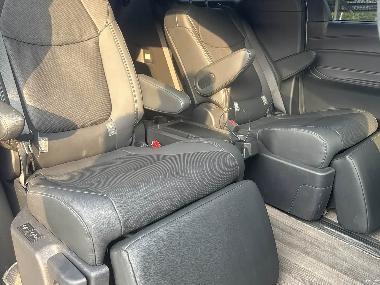 内饰也是相当的大气上档次,中控扶手位置采用了类似木质的面板,感觉很奢华。我特意选择了深色的内饰颜色,这样小孩子经常乘坐也就特别的耐脏,可以不用经常打理。座椅稍稍有点偏硬,可能个人比较瘦,坐不来太硬的座椅,喜欢很软的座椅吧。第二排的座椅坐着就挺舒服的,独立座椅带腿托,靠背调到合适的角度简直爽得很。