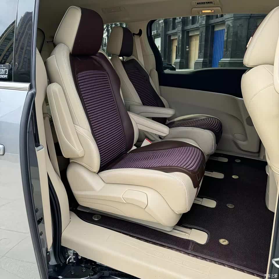 内饰豪华又舒适,是让我最满意的其中之一。内饰颜色具有商务气质又不失家庭温馨感,但是浅色容易脏,自己加了紫色座椅垫,也丰富了内饰的色彩。座椅是真皮和仿皮的,柔软适中,给乘坐者提供了非常高的舒适体验。第二排是独立的两张座椅,造型设计和主副驾驶位差不多,十分尊贵。