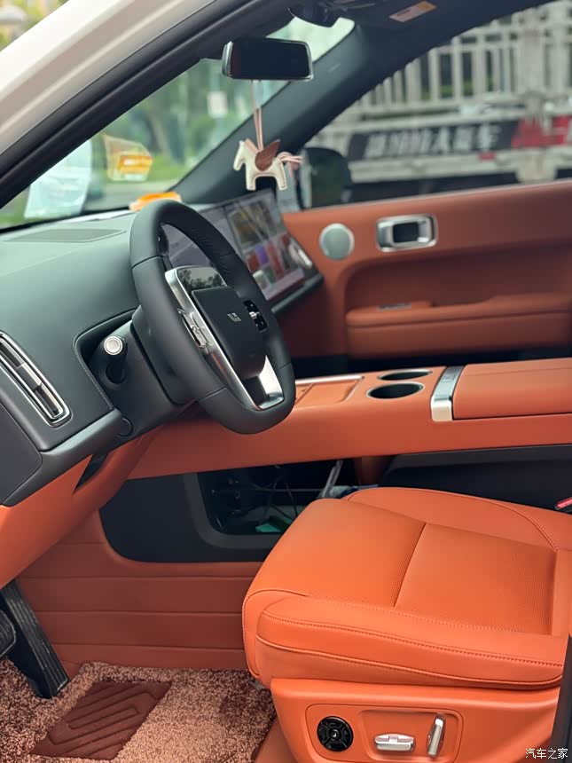 理想的内饰就不用说了,大部分都是nappa真皮,座椅填充海绵也很扎实。内饰本来想选白色的,最后还是怕不耐脏选择了橙色。但个人不太喜欢理想暗藏的氛围灯设计,橙色内饰下氛围灯更不明显了,夜晚驾驶时太暗。