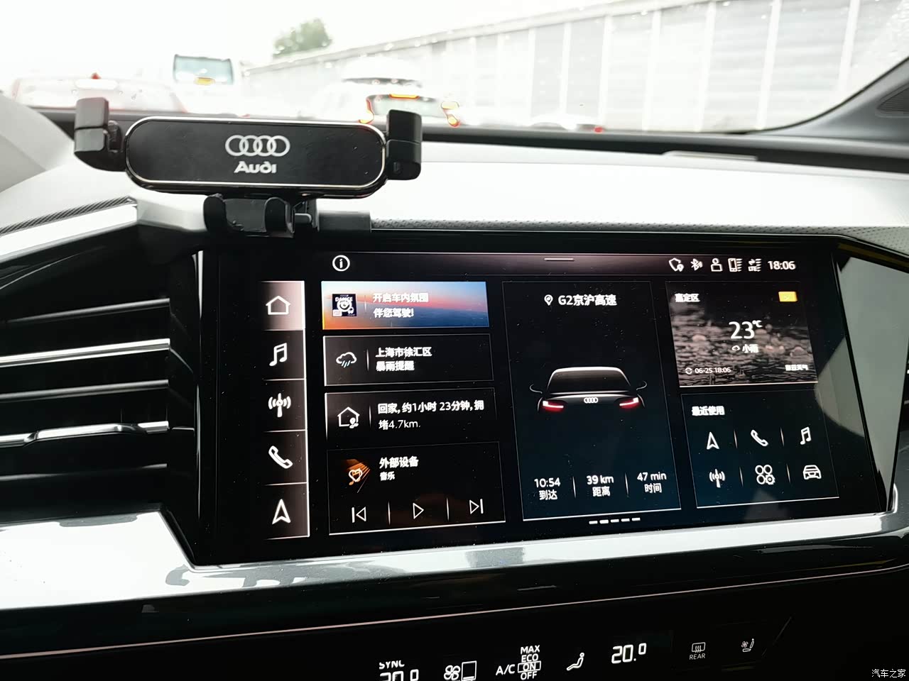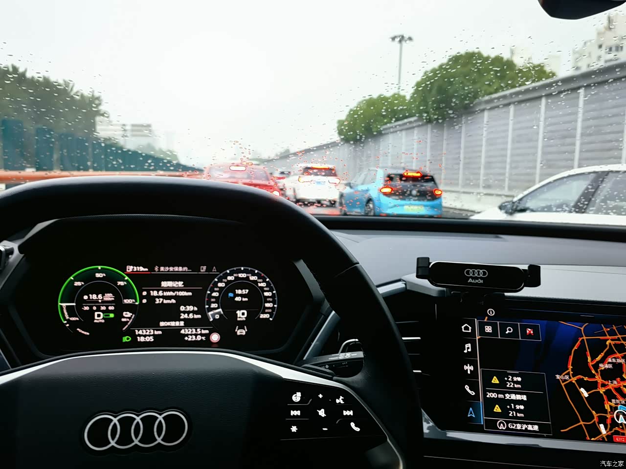 不比Telsa的极简风格,Q5 etron有点类似油车的奥迪内饰风格, 方向盘加热、真皮座椅的记忆功能、通风加热功能,让我驾驶的时候有了更多舒适感。 车机交互系统,还是依托于奥迪的MMI系统, 虽然屏幕没有新势力大,但双屏的设计说明奥迪电动车也在转变。 APP下载,Carplay都能很好的兼容, 对于车内娱乐没有太多追求的我来说,这样就足够了。 车内配置的负离子空气净化器,倒一直没有去研究,也不知道效果如何, 特别表扬一下: HUD抬头显效果真心不错,配合自带高德地图,动态提示效果不错,远超我的预期。